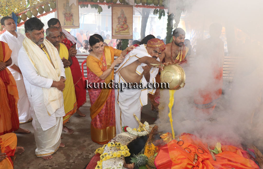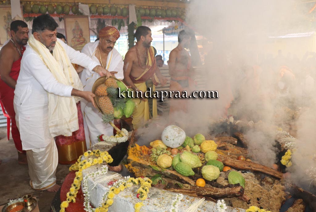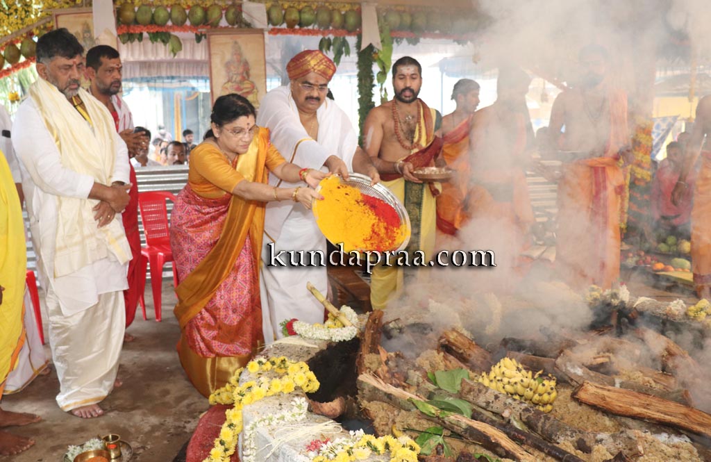 ಪೂರ್ಣಾಹುತಿಯ ಅಂಗವಾಗಿ ಕೆಪಿಸಿಸಿ ಅಧ್ಯಕ್ಷರಾದ ಡಿ.ಕೆ. ಶಿವಕುಮಾರ್ ಅವರು ಕಾರ್ಯಕ್ರಮದಲ್ಲಿ ಭಾಗವಹಿಸಿ ಮಾತನಾಡಿ, ಉಪ್ಪುಂದ ಶ್ರೀ ದುರ್ಗಾಪರಮೇಶ್ವರೀ ದೇವಿ ಎಲ್ಲರ ಕಷ್ಟಗಳನ್ನು ದೂರಮಾಡಿ ಸು:ಖ ಶಾಂತಿಯನ್ನು ನೀಡಲಿ. ಯು.ಬಿ. ಶೆಟ್ಟಿ ಅವರು ಯಾವುದೇ ಅಪೇಕ್ಷೆ ಇಲ್ಲದೇ ದೇವಿಯ ಸೇವೆಯನ್ನು ಮಾಡುತ್ತಿದ್ದಾರೆ. ಈ ಪವಿತ್ರ ಧಾರ್ಮಿಕ ಕಾರ್ಯದಲ್ಲಿ ಪಾಲ್ಗೊಳ್ಳುತ್ತಿರುವುದು ಸಂತೋಷ ತಂದಿದೆ. ಕಾರ್ಯಕ್ರಮದಲ್ಲಿ ಪಾಲ್ಗೊಳ್ಳುತ್ತಿರುವ ಎಲ್ಲರಿಗೂ ದೇವಿ ಒಳ್ಳೆಯದನ್ನು ಮಾಡಲಿ ಎಂದರು.