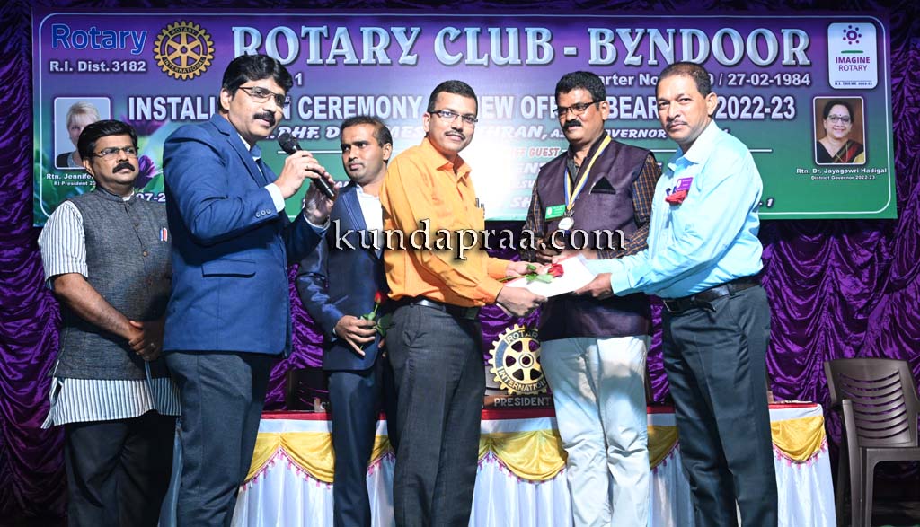 ರೋಟರಿ ವಲಯ ಸೇನಾನಿಯಗಿ ಆಯ್ಕೆಯಾದ ಬೈಂದೂರು ರೋಟರಿ ನಿಕಟಪೂರ್ವ ಅಧ್ಯಕ್ಷ ಡಾ. ಪ್ರವೀಣ ಶೆಟ್ಟಿ ಸ್ವಾಗತಿಸಿದರು. ನಿರ್ಗಮನ ರೋಟರಿ ಕಾರ್ಯದರ್ಶಿ ವೈ. ಮಂಗೇಶ ಶ್ಯಾನುಭಾಗ್ ವಾರ್ಷಿಕ ವರದಿ ವಾಚಿಸಿದರು. ನೂತನ ಕಾರ್ಯದರ್ಶಿ ಸುಧಾಕರ ಪಿ. ಬೈಂದೂರು ವಂದಿಸಿದರು. ಸುಬ್ರಹ್ಮಣ್ಯ ಜಿ. ಉಪ್ಪುಂದ ಕಾರ್ಯಕ್ರಮ ನಿರೂಪಿಸಿದರು.