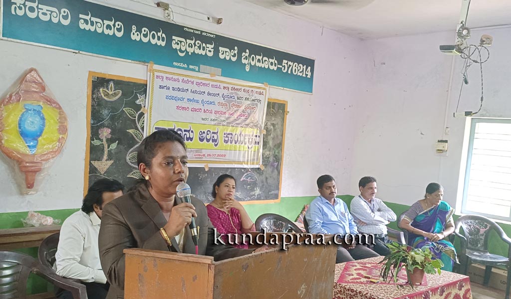 ಅವರು ಸೋಮವಾರ ಉಡುಪಿ ಜಿಲ್ಲಾ ಕಾನೂನು ಸೇವೆಗಳ ಪ್ರಾಧಿಕಾರ, ಉಡುಪಿ ಜಿಲ್ಲಾ ವಕೀಲರ ಸಂಘ, ಇಂಡಿಯನ್ ಸೀನಿಯರ್ ಚೆಂಚರ್ಸ್ ಬೈಂದೂರು, ಬೈಂದೂರು ಪದವಿಪೂರ್ವ ಕಾಲೇಜು ಪ್ರೌಢಶಾಲಾ ವಿಭಾಗ ಹಾಗೂ ಸರಕಾರಿ ಮಾದರಿ ಹಿರಿಯ ಪ್ರಾಥಮಿಕ ಶಾಲೆ ಸಹಯೋಗದೊಂದಿಗೆ ಮಾದರಿ ಶಾಲೆಯಲ್ಲಿ ಆಯೋಜಿಸಲಾದ ಕಾನೂನು ಅರಿವು ಕಾರ್ಯಕ್ರಮವನ್ನು ಶಾಲಾ ಆವರಣದಲ್ಲಿ ರಕ್ತ ಚಂದನ ಗಿಡ ನೆಟ್ಟು ಉದ್ಘಾಟಿಸಿದರು.