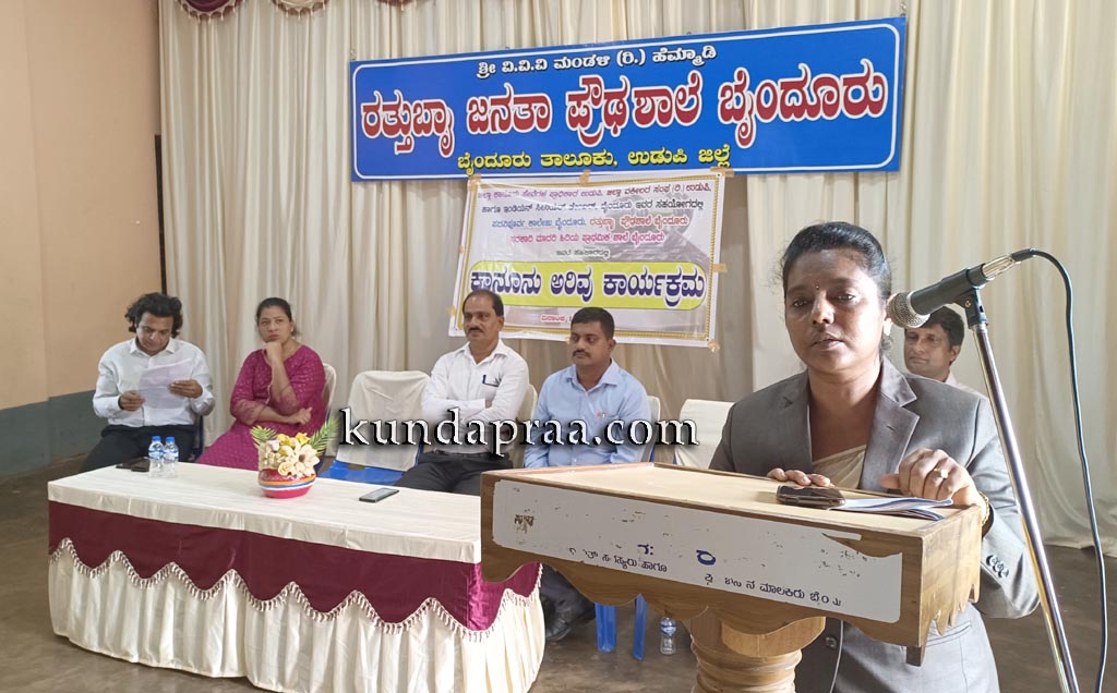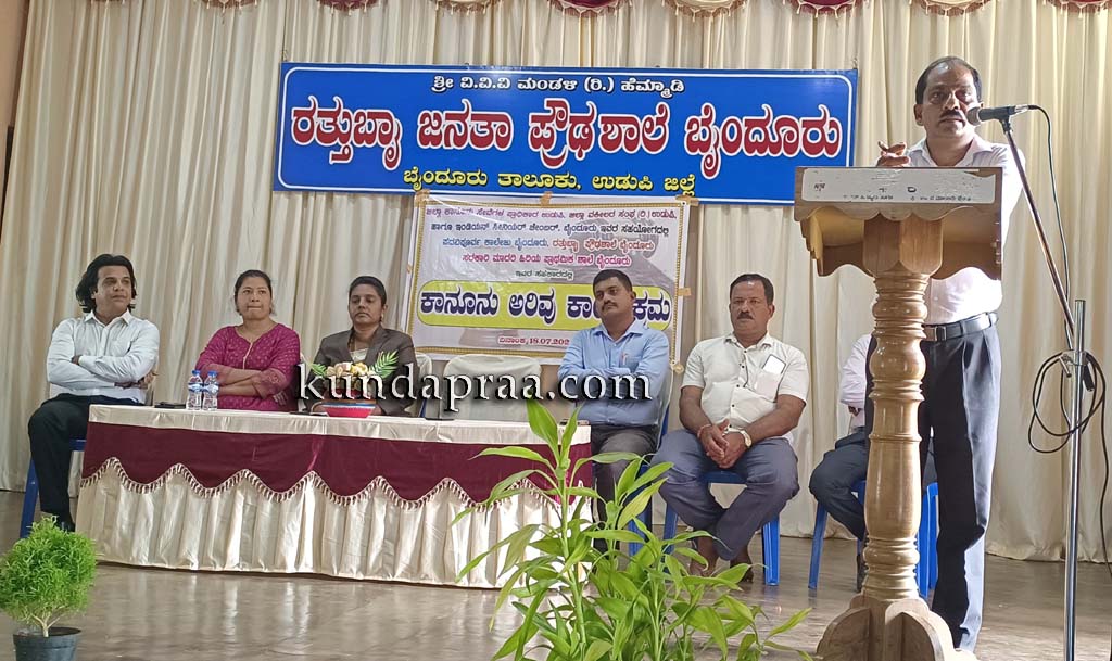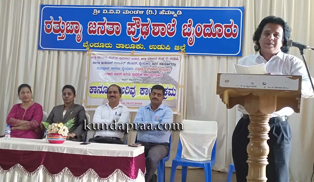 ಅವರು ಉಡುಪಿ ಜಿಲ್ಲಾ ಕಾನೂನು ಸೇವೆಗಳ ಪ್ರಾಧಿಕಾರ, ಉಡುಪಿ ಜಿಲ್ಲಾ ವಕೀಲರ ಸಂಘ, ಇಂಡಿಯನ್ ಸೀನಿಯರ್ ಚೆಂಬರ್ಸ್ ಬೈಂದೂರು, ರತ್ತೂಬಾಯಿ ಜನತಾ ಪ್ರೌಢಶಾಲೆ ಸಹಯೋಗದೊಂದಿಗೆ ರತ್ತೂಬಾಯಿ ಜನತಾ ಪ್ರೌಢಶಾಲೆ ಆಯೋಜಿಸಲಾದ ಕಾನೂನು ಅರಿವು ಕಾರ್ಯಕ್ರಮ ಉದ್ಘಾಟಿಸಿ ಮಾತನಾಡಿದರು.