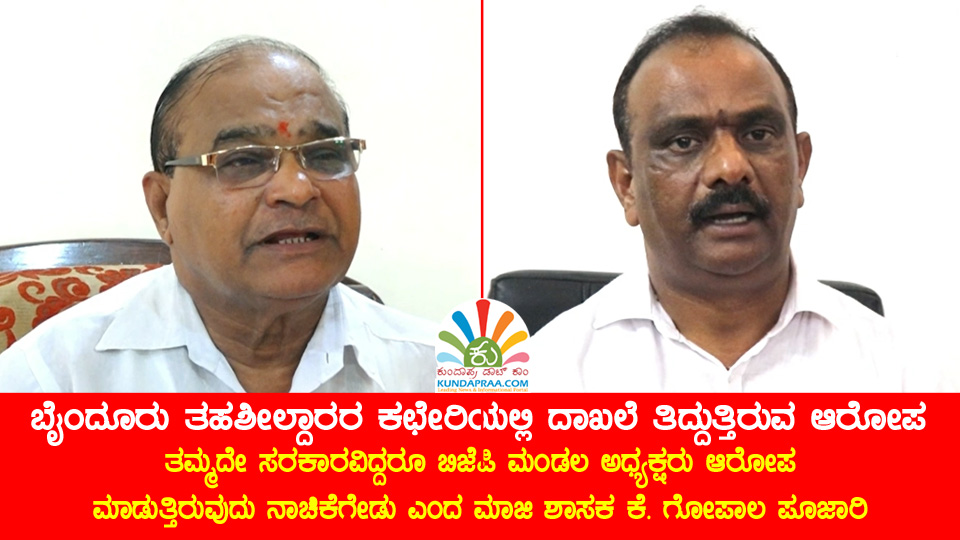 Share Facebook Twitter WhatsApp LinkedIn ಬೈಂದೂರು ತಹಶೀಲ್ದಾರರ ಕಛೇರಿಯಲ್ಲಿ ದಾಖಲೆ ತಿದ್ದುತ್ತಿರುವ ಆರೋಪ ಹಿನ್ನೆಲೆ – ಬಿಜೆಪಿ ಕಾಂಗ್ರೆಸ್ ಟಾಕ್ ವಾರ್. ತಮ್ಮದೇ ಸರಕಾರವಿದ್ದರೂ ಬಿಜೆಪಿ ಮಂಡಲ ಅಧ್ಯಕ್ಷರು ಆರೋಪ ಮಾಡುತ್ತಿರುವುದು ನಾಚಿಕೆಗೇಡು ಎಂದ ಮಾಜಿ ಶಾಸಕ ಕೆ. ಗೋಪಾಲ ಪೂಜಾರಿ