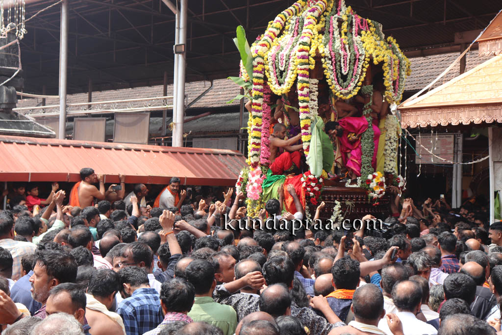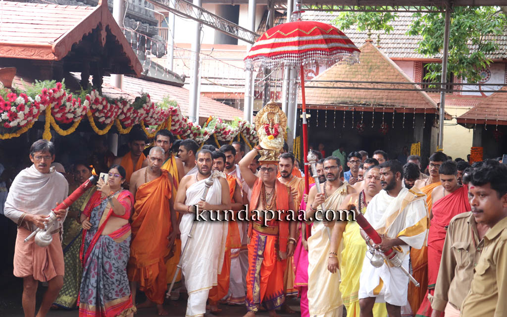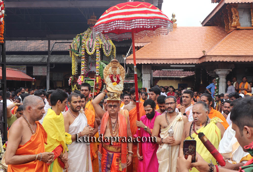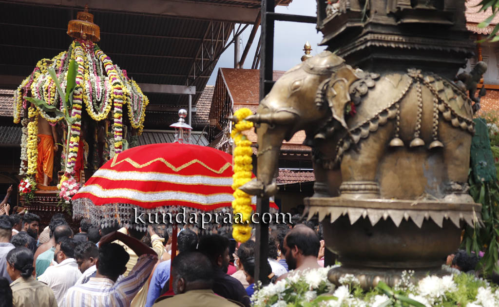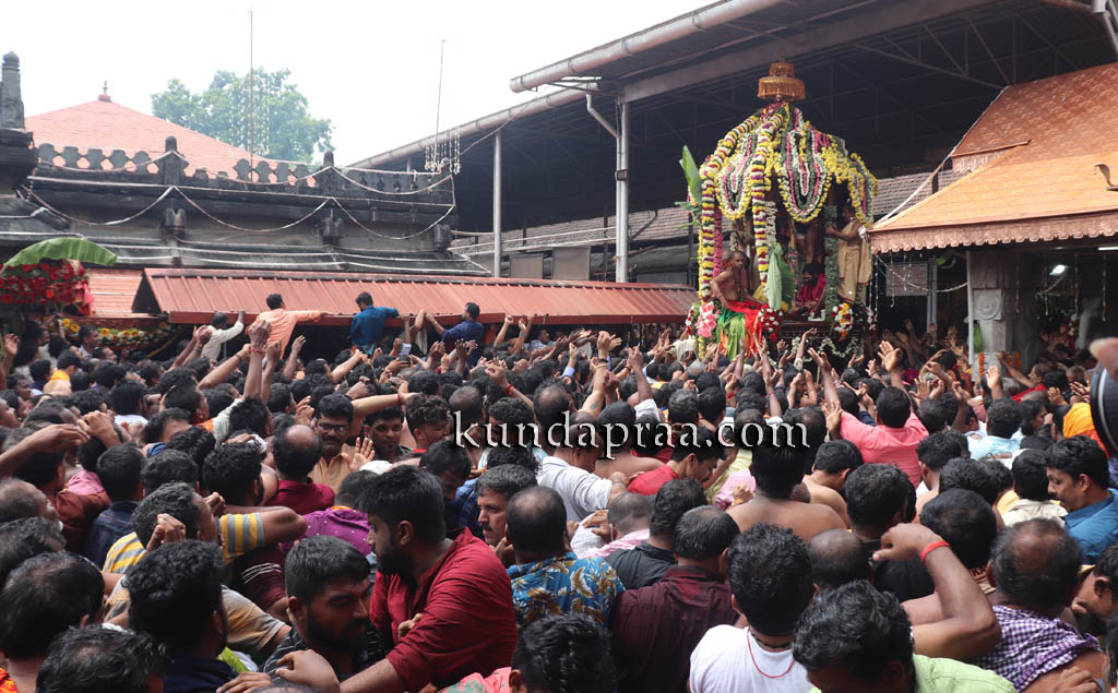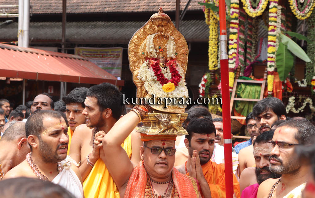 ದೇವಸ್ಥಾನದ ಪ್ರಧಾನ ಅರ್ಚಕ, ತಂತ್ರಿ ಕೆ. ರಾಮಚಂದ್ರ ಅಡಿಗ ಅವರು ರಥಾರೋಹಣಳಾದ ಶ್ರೀ ದೇವಿಗೆ ಪೂಜೆ ನೆರವೇರಿಸಿ, ಮಂಗಳಾರತಿ ಎತ್ತಿದ ಬಳಿಕ, ರಥ ಪೂಜೆಯ ನಡೆಸಲಾಯಿತು. ನಂತರ ಸೇರಿದ್ದ ಸಾವಿರಾರು ಜನರು ಶ್ರೀ ದೇವಿಯ ಜಯ ಘೋಷದೊಂದಿಗೆ ರಥವನ್ನು ಎಳೆದರು. ದೇವಳದ ಒಳ ಪ್ರಾಂಗಣದಲ್ಲಿ ಒಂದು ಸುತ್ತು ಬಂದ ಬಳಿಕ ರಥದ ಮೇಲಿನಿಂದ ಅರ್ಚಕರು ಎಸೆದ ನಾಣ್ಯವನ್ನು ಪಡೆಯಲು ಭಕ್ತರು ಮುಗಿಬಿದ್ದರು. ಉತ್ಸವ ಮೂರ್ತಿಯನ್ನು ರಥದಿಂದ ಕೆಳಕ್ಕೆ ತರುವ ಕ್ಷಣಗಳಿಗಾಗಿ ಕಾಯುತ್ತಿದ್ದ ಭಕ್ತ ವರ್ಗ, ಕ್ಷಣ ಮಾತ್ರದಲ್ಲಿ ರಥಕ್ಕೆ ಅಲಂಕರಿಸಿದ್ದ ಹೂಗಳನ್ನು ಕಿತ್ತು ಪ್ರಸಾದವಾಗಿ ಸ್ವೀಕರಿಸಿದರು.