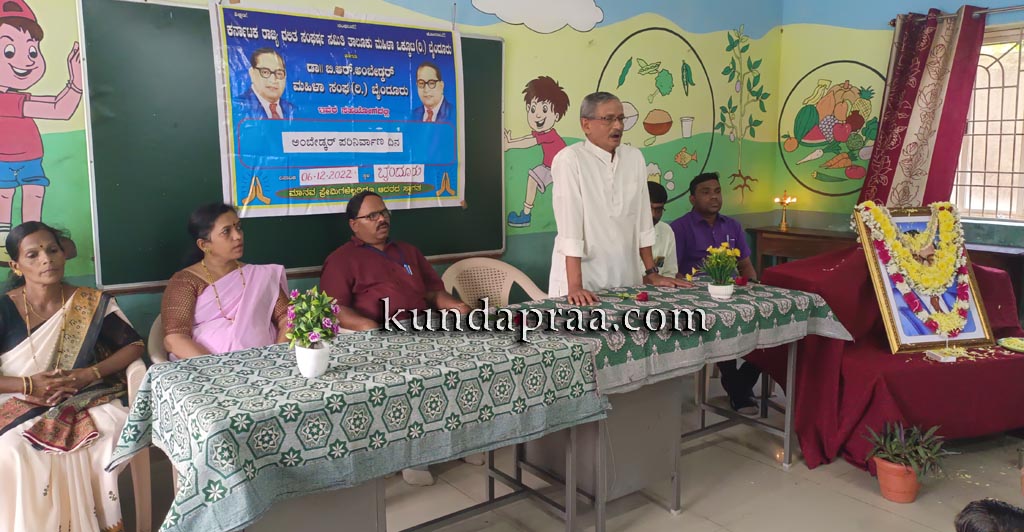 ಕರ್ನಾಟಕ ರಾಜ್ಯ ದಲಿತ ಸಂಘರ್ಷ ಸಮಿತಿ, ತಾಲೂಕು ಮಹಿಳಾ ಒಕ್ಕೂಟ ಬೈಂದೂರು ಹಾಗೂ ಡಾ. ಬಿ.ಆರ್. ಅಂಬೇಡ್ಕರ್ ಮಹಿಳಾ ಸಂಘ ಬೈಂದೂರು ಆಶ್ರಯದಲ್ಲಿ ಮಂಗಳವಾರ ಡಾ. ಬಿ. ಆರ್. ಅಂಬೇಡ್ಕರ್ ಪರಿನಿರ್ವಾಣ ದಿನದ ಅಂಗವಾಗಿ ಬೈಂದೂರಿನ ಪರಿಶಿಷ್ಟ ವರ್ಗದ ಆಶ್ರಮ ಶಾಲೆಯಲ್ಲಿ ಆಯೋಜಿಸಲಾಗಿದ್ದ ಕಾರ್ಯಕ್ರಮದಲ್ಲಿ ವಿದ್ಯಾರ್ಥಿಗಳಿಗೆ ಹಣ್ಣು ಹಂಪಲು ವಿತರಿಸಿ ಮಾತನಾಡಿ, ಶೋಷಿತರು ದನಿಯಾಗಿದ್ದ ಅಂಬೇಡ್ಕರ್ ಅವರು ಪ್ರಪಂಚಕ್ಕೆ ಮಾದರಿಯಾದ ಸಂವಿಧಾನವನ್ನು ನೀಡಿದರು. ಅದರ ಪ್ರಯೋಜವನ್ನು ಪಡೆದು ಮುಖ್ಯವಾಹಿನಿಗೆ ಬಂದವರು, ತಮ್ಮ ಸಮುದಾಯದ ಬಡವರು, ಶೋಷಿತರ ಬಗ್ಗೆ ಕಾಳಹಿ ವಹಿಸುವುದು ಅತಿಮುಖ್ಯವಾಗಿದೆ ಎಂದರು.