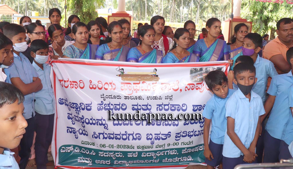 ಆವರು ಶುಕ್ರವಾರ ನಾವುಂದ ಸರಕಾರಿ ಹಿರಿಯ ಪ್ರಾಥಮಿಕ ಶಾಲೆಯ ಮುಖ್ಯ ಶಿಕ್ಷಕರು ಹಾಗೂ ಜಿಪಿಟಿ ಶಿಕ್ಷಕರನ್ನು ಹೆಚ್ಚುವರಿ ಮಾಡಿರುವುದನ್ನು ಕೈಬಿಡಲು ಆಗ್ರಹಿಸಿ ಶಾಲಾ ವಿದ್ಯಾರ್ಥಿಗಳು, ಪೋಷಕರು, ಹಳೆವಿದ್ಯಾರ್ಥಿಗಳು ಹಮ್ಮಿಕೊಂಡ ಪ್ರತಿಭಟನೆಯ ನೇತೃತ್ವ ವಹಿಸಿ ಮಾತನಾಡಿ, 63 ವಿದ್ಯಾರ್ಥಿಗಳಿದ್ದ ಶಾಲೆಯಲ್ಲಿ, ಇದೀಗ 305 ವಿದ್ಯಾರ್ಥಿಗಳು ವ್ಯಾಸಂಗ ಮಾಡುತ್ತಿದ್ದಾರೆ. ಮಕ್ಕಳ ಸಂಖ್ಯೆಗೆ ಅನುಗುಣವಾಗಿ 10 ಶಿಕ್ಷಕರು ಇರಬೇಕಿದ್ದು, ಪ್ರಸ್ತುತ 7 ಮಂದಿ ಶಿಕ್ಷಕರು ಮಾತ್ರವೇ ಕರ್ತವ್ಯ ನಿರ್ವಹಿಸುತ್ತಿದ್ದಾರೆ. ಇದೀಗ ಮತ್ತೆ ಇಬ್ಬರು ಶಿಕ್ಷಕರನ್ನು ಹೆಚ್ಚುವರಿಯನ್ನಾಗಿಸಿ ವರ್ಗಾವಣೆ ಮಾಡಿದರೆ ಮಕ್ಕಳ ಶೈಕ್ಷಣಿಕ ಭವಿಷ್ಯದ ಮೇಲೆ ಪ್ರಭಾವ ಬೀರಲಿದೆ. ತಕ್ಷಣ ಹೆಚ್ಚುವರಿ ಆದೇಶವನ್ನು ಹಿಂಪಡೆದು ಯಥಾಸ್ಥಿತಿ ಕಾಯ್ದುಕೊಳ್ಳುವುದು ಸೂಕ್ತ ಎಂದರು.