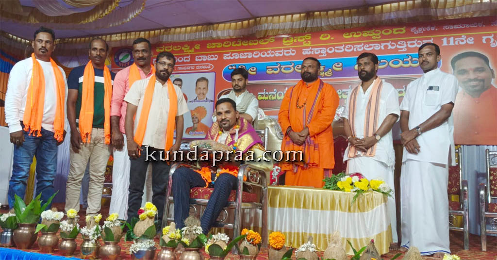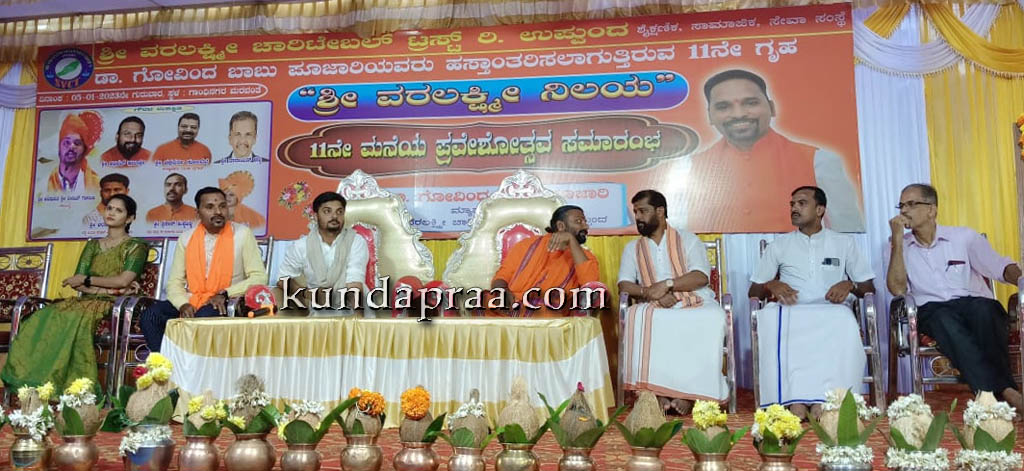 ಅವರು ಶ್ರೀ ವರಲಕ್ಷ್ಮೀ ಚಾರಿಟೇಬಲ್ ಟ್ರಸ್ಟ್ ರಿ. ಉಪ್ಪುಂದ ಇದರ ವತಿಯಿಂದ ಮರವಂತೆ ಗಾಂಧಿನಗರದ ಹಿಂದೂ ಕಾರ್ಯಕರ್ತ ರಾಜು ಮರವಂತೆ ಅವರಿಗೆ ನಿರ್ಮಿಸಿಕೊಡಲಾದ ‘ಶ್ರೀ ವರಲಕ್ಷ್ಮೀ ನಿಲಯ’ ಉದ್ಘಾಟಿಸಿ ಆಶೀರ್ವದಿಸಿ, ಪರರ ಕಷ್ಟಕ್ಕೆ ಸ್ಪಂದಿಸುವ ಶ್ರೇಷ್ಠ ಚಿಂತನೆಗಳು ಮುಖ್ಯ. ಪರರಿಗೆ ಒಳಿತಾಗಲು ಶ್ರಮಿಸುತ್ತಿರುವ ಡಾ. ಗೋವಿಂದ ಬಾಬು ಪೂಜಾರಿಯವರ ಸೇವಾ ಕೈಂಕರ್ಯ ಶ್ರೇಷ್ಠವಾದುದು ಎಂದರು.