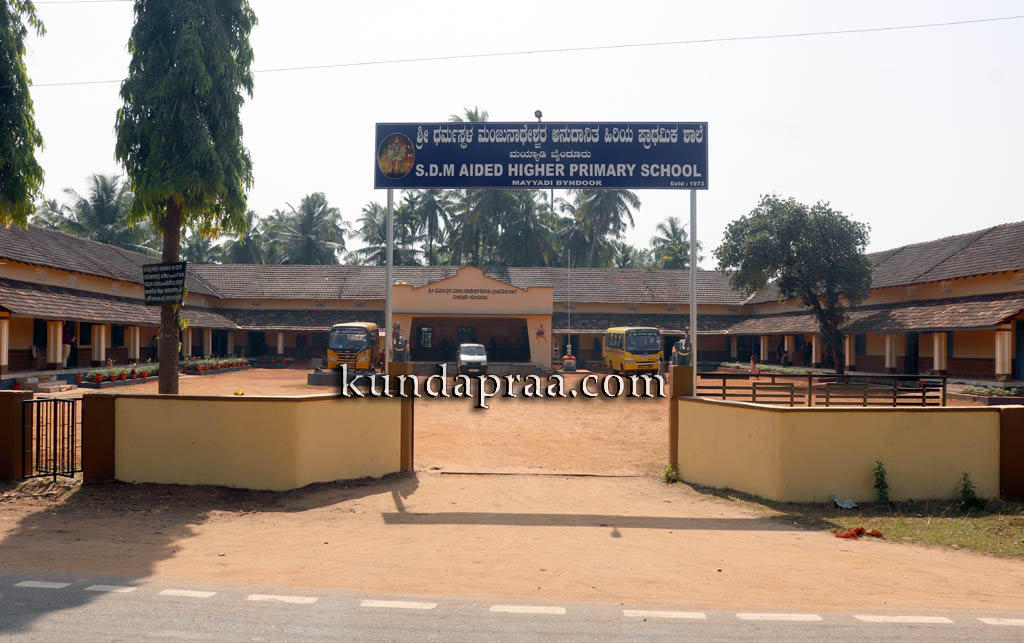 ಎಸ್.ಡಿ.ಎಂ ಹಿರಿಯ ಪ್ರಾಥಮಿಕ ಶಾಲೆಯಾಗಿ ಗುರುತಿಸಿಕೊಳ್ಳುವ ಮೊದಲು ಮಯ್ಯಾಡಿಯಲ್ಲಿದ್ದುದು ನಿತ್ಯಾನಂದ ಎಡೆಡ್ ಹೈಯರ್ ಪ್ರೈಮೆರಿ ಸ್ಕೂಲ್ ಎಂಬ ಅನುದಾನಿತ ಶಾಲೆ. 1938ರಲ್ಲಿ ಶೈಕ್ಷಣಿಕ ಸೇವೆಯ ಮಹದಾಸೆಯಿಂದ ಸಮಾನ ಮನಸ್ಕರೊಡಗೂಡಿ ಆರಂಭಿಸಿದ ಶಾಲೆ ಮಯ್ಯಾಡಿಯ ಖಾಸಗಿ ಕಟ್ಟಡಗಳಲ್ಲಿಯೇ ಹತ್ತಾರು ವರ್ಷ ಮುನ್ನಡೆದಿತ್ತು. ಎಂ. ದ್ಯಾವಪ್ಪ ಶೇರುಗಾರ್ ಅವರು ಶಾಲೆಯ ಮುಖ್ಯೋಪಧ್ಯಾಯರಾಗಿದ್ದರು. ಕಾಲಕ್ರಮೇಣ ಸರಕಾರದ ನೀತಿಯಂತೆ ಅನುದಾನ ಪಡೆಯಲು ಸ್ವಂತ ಕಟ್ಟಡ ಪಡೆಯುವುದು ಅನಿವಾರ್ಯವಾದಾಗ ಆಡಳಿತ ಮಂಡಳಿಗೆ ಜಾಗ ಖರೀದಿಸಿ, ಕಟ್ಟಡ ನಿರ್ಮಿಸುವುದು ಕಷ್ಟಸಾಧ್ಯವಾಯಿತು. ಆಗ ಮಯ್ಯಾಡಿಯ ಶಿಕ್ಷಣ ಪ್ರೀಯ ಹಿರಿಯರಿಗೆ ಹೊಳೆದದ್ದೇ ಧರ್ಮಸ್ಥಳದ ಹೆಸರು. ಕುಂದಾಪ್ರ ಡಾಟ್ ಕಾಂ ವರದಿ.