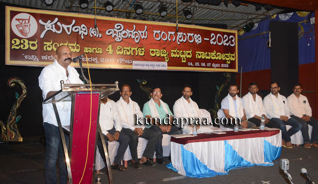 ಸುರಭಿ ರಿ. ಬೈಂದೂರು ಆಶ್ರಯದಲ್ಲಿ ಇಲ್ಲಿನ ಶಾರದಾ ವೇದಿಕೆಯಲ್ಲಿ ಆಯೋಜಿಸಲಾದ ರಂಗಸುರಭಿ – 2023ರ ನಾಲ್ಕು ದಿನಗಳ ರಾಜ್ಯಮಟ್ಟದ ನಾಟಕೋತ್ಸವದ ಮೂರನೇ ದಿನದ ಕಾರ್ಯಕ್ರಮದಲ್ಲಿ ಸನ್ಮಾನ ಸ್ವೀಕರಿಸಿ ಮಾತನಾಡಿ ರಂಗಭೂಮಿ ಪ್ರತಿ ಕಲಾವಿದನಿಗೂ ಧೈರ್ಯ ತುಂಬಿಕೊಡುತ್ತದೆ. ರಂಗ ಚಟುವಟಿಕೆಗಳು ಜಿಲ್ಲಾ ಕೇಂದ್ರದಷ್ಟೇ ವಿಜೃಂಭಣೆಯಿಂದ ಬೈಂದೂರಿನಂತಹ ಗ್ರಾಮೀಣ ಪ್ರದೇಶದಲ್ಲಿ ಜರುಗುತ್ತಿರುವುದು ಮತ್ತು ಅದಕ್ಕೆ ತಕ್ಕಂತೆ ಪ್ರಜ್ಞಾವಂತ ಪ್ರೇಕ್ಷಕರೂ ಹುಟ್ಟಿಕೊಂಡಿರುವುದು. ಈ ಎಲ್ಲದಕ್ಕೂ ಪುರಕ ವಾತಾವರಣ ನಿರ್ಮಿಸಿದ ಸಂಸ್ಥೆಗಳ ಶ್ರಮ ದೊಡ್ಡದು ಎಂದರು.