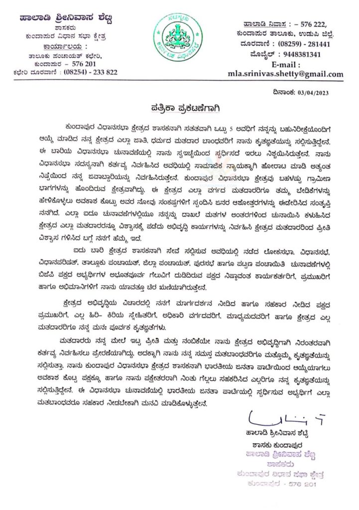 ವಿಧಾನಸಭಾ ಚುನಾವಣೆಗೆ ಪುರ್ವಭಾವಿಯಾಗಿ ಬೆಂಗಳೂರಿನಲ್ಲಿ ನಡೆದ ಬಿಜೆಪಿ ಕೋರ್ ಕಮಿಟಿ ಸಭೆಯಲ್ಲಿ ಸ್ವತಃ ಹಾಲಾಡಿ ಶ್ರೀನಿವಾಸ ಶೆಟ್ಟಿ ಅವರೇ ಈ ಇಚ್ಛೆ ವ್ಯಕ್ತಪಡಿಸಿರುವ ಬಗ್ಗೆ ಮಾಹಿತಿಗಳು ಲಭ್ಯವಾಗಿದ್ದ ಇದನ್ನು ಸ್ವತಃ ಶಾಸಕರ ಆಪ್ತರು ದೃಢೀಕರಿಸಿದ್ದಾರೆ. ಎ.ಜಿ. ಕೊಡ್ಗಿ ಅವರ ಪುತ್ರ ಹಾಗೂ ತಮ್ಮ ಆಪ್ತ ಕಿರಣ ಕೊಡ್ಗಿ ಅವರಿಗೆ ಕುಂದಾಪುರದ ಟಿಕೆಟ್ ನೀಡುವಂತೆ ಬೇಡಿಕೆ ಇರಿಸಿದ್ದಾರೆ ಎನ್ನಲಾಗಿದೆ.