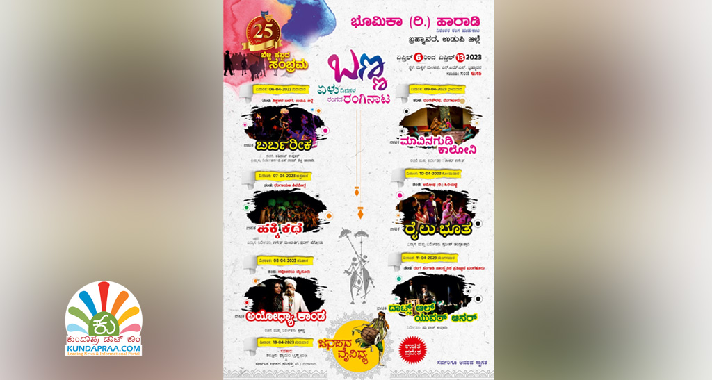 ಬ್ರಹ್ಮಾವರ: ನಾಟಕಗಳಿಂದ ರಾಜ್ಯ ಮತ್ತು ರಾಷ್ಟ್ರಮಟ್ಟದಲ್ಲೇ ಹೆಸರು ಮಾಡಿದ ಭೂಮಿಕಾ ರಿ. ಹಾರಾಡಿ ತನ್ನ 25ನೇ ವರ್ಷದ ಸಂಭ್ರಮದಲ್ಲಿದ್ದು, ಈ ಪ್ರಯುಕ್ತ ಭೂಮಿಕಾ ತಂಡವು ತನ್ನ ವಾರ್ಷಿಕ ಸಂಭ್ರಮ ‘ಬಣ್ಣ’ ವಿಶಿಷ್ಠವಾಗಿ ಆಚರಿಸುತ್ತಿದೆ.