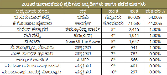 ಆದರೆ, 2013ರ ಚುನಾವಣೆಯಲ್ಲಿ ಮತ್ತೆ ಕ್ಷೇತ್ರ ಕಾಂಗ್ರೆಸ್ ತೆಕ್ಕೆಗೆ ಬಂತು. ಗೋಪಾಲ ಪೂಜಾರಿ 82,277 ಮತಗಳನ್ನು ಪಡೆದು ಬಿಜೆಪಿಯ ಸುಕುಮಾರ ಶೆಟ್ಟಿ ವಿರುದ್ಧ 30 ಸಾವಿರಕ್ಕೂ ಅಧಿಕ ಮತಗಳಿಂದ ಭರ್ಜರಿ ಜಯ ಸಾಧಿಸಿದ್ದರು. ಆದರೆ 2018ರ ಚುನಾವಣೆಯಲ್ಲಿ ಹಿಂದಿನ ಚುನಾವಣೆಯ ಅಂತರವವನ್ನು ಮೆಟ್ಟಿ ನಿಲ್ಲಲು ಯಶಸ್ವಿಯಾದ ಬಿಜೆಪಿ ಅಭ್ಯರ್ಥಿ ಸುಕುಮಾರ ಶೆಟ್ಟಿ ಅವರು ಗೋಪಾಲ ಪೂಜಾರಿಯವರನ್ನು 24,393 ಮತಗಳ ಅಂತರದಿಂದ ಸೋಲಿಸಿ ಶಾಸಕ ಸ್ಥಾನ ಅಲಂಕರಿಸಿದರು. /ಕುಂದಾಪ್ರ ಡಾಟ್ ಕಾಂ ವರದಿ/