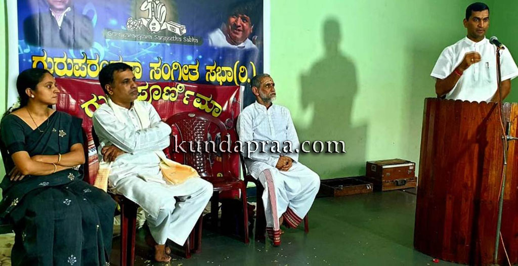 ಮರವಂತೆಯ ಸಾಧನಾ ಸಮುದಾಯ ಭವನದ ವಿ. ಕೆ. ಕಾಮತ್ ಸಭಾಗೃಹದಲ್ಲಿ ಕುಂದಾಪುರದ ಗುರುಪರಂಪರಾ ಸಂಗೀತಸಭಾ ಆಶ್ರ್ರಯದಲ್ಲಿ ಭಾನುವಾರ ನಡೆದ ಗುರುಪೂರ್ಣಿಮಾ-ಗುರುಪೂಜೆ ಕಾರ್ಯಕ್ರಮದಲ್ಲಿ. ಅವರು ಗೌರವ ಅತಿಥಿಯಾಗಿದ್ದರು.