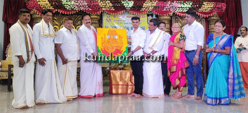 ಮಂಗಳೂರು ಮಹಾಲಸಾ ವಿದ್ಯಾಲಯದಲ್ಲಿ ವ್ಯಾಸಂಗ ಮಾಡುತ್ತಿರುವ ಚಿತ್ರಕಲಾ ವಿದ್ಯಾರ್ಥಿ ಪ್ರೀತಮ್ ಆಚಾರ್ಯ ಹೊದ್ರಾಳಿ ಅವರ ಕುಂಚದಲ್ಲಿ ಮೂಡಿಬಂದ ಆಕರ್ಷಕ ಶ್ರೀ ವಿಶ್ವಕರ್ಮ ದೇವರ ಚಿತ್ತಾರದ ಕ್ಯಾನ್ವಾಸ್ನ್ನು ಶ್ರೀ ವಿಶ್ವಕರ್ಮ ಬ್ರಾಹ್ಮಣ ಸಮಾಜ ಯುವಕ ಸೇವಾ ಸಂಘದ ಅಧ್ಯಕ್ಷ ರಥಶಿಲ್ಪಿ ರಾಜಗೋಪಾಲ ಆಚಾರ್ಯ ಕೋಟೇಶ್ವರ ಅವರಿಗೆ ಹಸ್ತಾಂತರಿಸಿದರು.