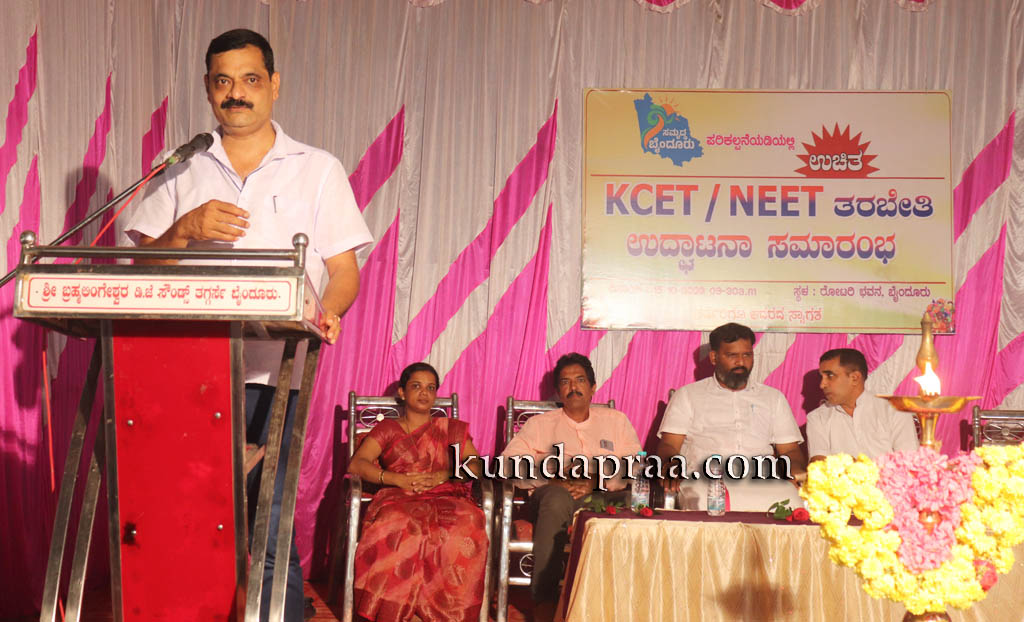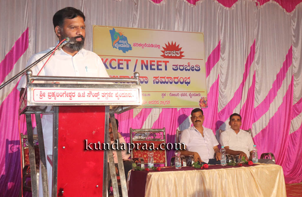 ಅವರು ಸಮೃದ್ಧ ಬೈಂದೂರು ಪರಿಕಲ್ಪನೆಯಡಿಯಲ್ಲಿ ಬೈಂದೂರು ಹಾಗೂ ಉಪ್ಪುಂದ ಸರಕಾರಿ ಪಿಯು ಕಾಲೇಜು ವಿದ್ಯಾರ್ಥಿಗಳಿಗಾಗಿ, ಜ್ಞಾನದೀಪ ಟುಟೋರಿಯಲ್ ಕಾಲೇಜಿನ ಸಹಯೋಗದೊಂದಿಗೆ ಹಮ್ಮಿಕೊಂಡ ಉಚಿತ ಕೆಸಿಇಟಿ ಹಾಗೂ ನೀಟ್ ತರಬೇತಿ ತರಬೇತಿಯನ್ನು ಉದ್ಘಾಟಿಸಿ ಮಾತನಾಡಿ ಬಡತನವೆಂಬುದು ಕೊರತೆಯಾಗಬಾರದು. ಅದನ್ನೇ ಸವಾಲಾಗಿ ಸ್ವೀಕರಿಸಿದ ಅದೇಷ್ಟೋ ಮಂದಿ ಸ್ಪರ್ಧಾತ್ಮಕ ಪರೀಕ್ಷೆಗಳಲ್ಲಿ ಗೆದ್ದ ನೂರಾರು ಉದಾಹರಣೆಗಳು ನಮ್ಮ ಮುಂದಿದೆ. ಅಂತಹದ್ದೊಂದು ಇಚ್ಚಾಶಕ್ತಿಯನ್ನು ಬೆಳಿಸಿಕೊಳ್ಳಿ ಎಂದರು.