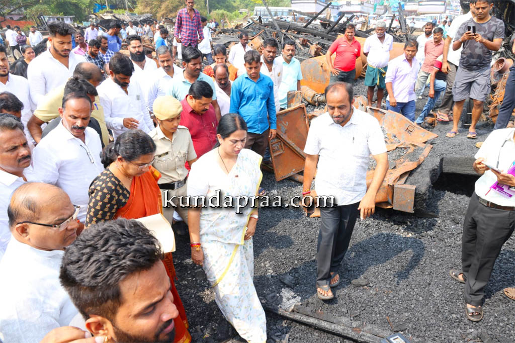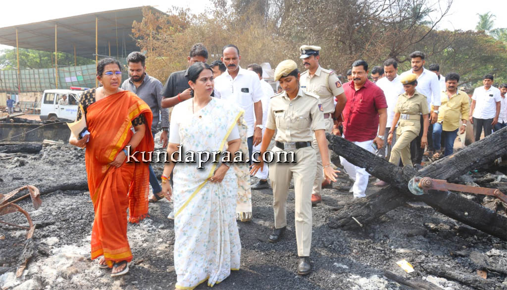 ಉಡುಪಿ: ಉಡುಪಿಯ ಗಂಗೊಳ್ಳಿಯ ಬಂದರಿನಲ್ಲಿ ಅಗ್ನಿ ದುರಂತ ನಡೆದ ಸ್ಥಳಕ್ಕೆ ಶುಕ್ರವಾರ ಉಡುಪಿ ಜಿಲ್ಲಾ ಉಸ್ತುವಾರಿ ಸಚಿವರಾದ ಲಕ್ಷ್ಮೀ ಆರ್ ಹೆಬ್ಬಾಳ್ಕರ್ ಭೇಟಿ ನೀಡಿದರು. ಅಗ್ನಿ ಆಕಸ್ಮಿಕ ನಡೆದ ಸ್ಥಳವನ್ನು ವೀಕ್ಷಿಸಿದ ಸಚಿವರು, ಮೀನುಗಾರಿಕೆ ಇಲಾಖೆಯ ಅಧಿಕಾರಿಗಳು ಹಾಗೂ ಸ್ಥಳೀಯ ಮೀನುಗಾರರೊಂದಿಗೆ ಚರ್ಚೆ ನಡೆಸಿದರು.