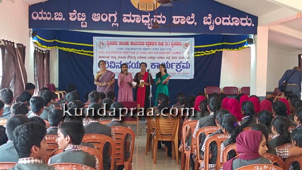 ಗುರುವಾರ ಇಲ್ಲಿನ ಯು.ಬಿ. ಶೆಟ್ಟಿ ಆಂಗ್ಲ ಮಾಧ್ಯಮ ಶಾಲೆಯಲ್ಲಿ ಬೈಂದೂರು ತಾಲೂಕು ಕಾರ್ಯನಿರತ ಪತ್ರಕರ್ತರ ಸಂಘದ ವತಿಯಿಂದ ಉಡುಪಿ ಜಿಲ್ಲಾ ಕಾರ್ಯನಿರತ ಪತ್ರಕರ್ತರ ಸಂಘದ ರಜತ ಮಹೋತ್ಸವ ಆಚರಣೆಯ ಅಂಗವಾಗಿ ಕರ್ನಾಟಕ ರಾಜ್ಯ ಮಹಿಳಾ ದೌರ್ಜನ್ಯ ವಿರೋಧಿ ಒಕ್ಕೂಟ, ಉಡುಪಿ ಜಿಲ್ಲಾ ತಂಡದಿಂದ ಆಯೋಜಿಸಲಾದ ಅರಿವಿನ ಪಯಣ ಕಾರ್ಯಕ್ರಮದಲ್ಲಿ ಮಾತನಾಡಿದರು.