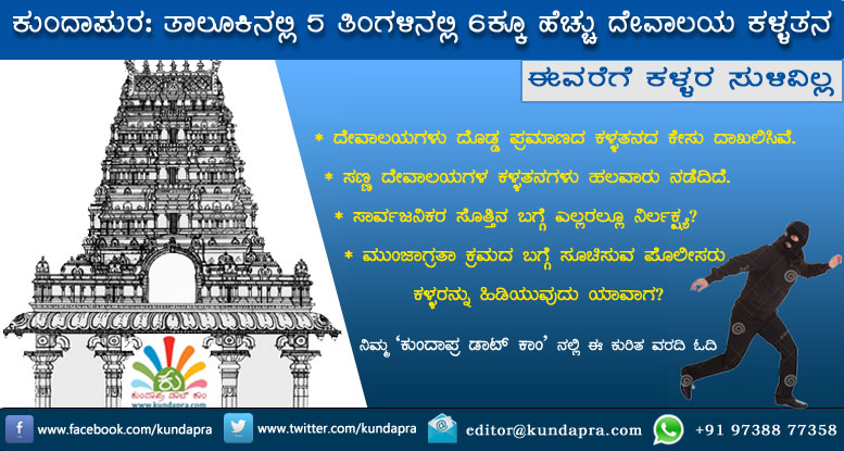 ಮಳೆಗಾಲ ಪ್ರಾರಂಭವಾದ ಕೂಡಲೇ ದೇವಸ್ಥಾನಗಳ ಕಳ್ಳತನ ನಡೆಯುವುದು ಸಾಮಾನ್ಯವಾಗಿಬಿಟ್ಟಿದೆ. ಆದರೆ ತಾಲೂಕಿನಲ್ಲಾದ ದೇವಾಲಯಗಳ ಕಳ್ಳತನದ ಯಾವೊಬ್ಬ ಆರೋಪಿಯನ್ನು ಬಂಧಿಸಲು ನಮ್ಮ ಪೋಲೀಸರು ಯಶಸ್ವಿಯಾಗಿಲ್ಲ ಎನ್ನುವುದು ಬೇಸರದ ಸಂಗತಿ. ಹಾಗಾಗಿ ದಿನೇದಿನೇ ದೇವಸ್ಥಾನಗಳೇ ಕಳ್ಳರ ಟಾರ್ಗೆಟ್ ಆಗುತ್ತಿವೆ. ದೇವಸ್ಥಾನಗಳಲ್ಲಿ ರಾತ್ರಿಯ ಹೊತ್ತು ಕಾವಲು ವ್ಯವಸ್ಥೆ ಇಲ್ಲದಿರುವುದು. ಬಹುತೇಕ ಹೆಚ್ಚಿನ ದೇಗುಲಗಳಲ್ಲಿ ಸಿಸಿ ಕ್ಯಾಮರವನ್ನು ಅಳವಡಿಸಿಲ್ಲದಿರುವುದು. ಜನ ಸಂಚಾರ ಕಡಿಮೆ ಇರುವುದು, ಮಳೆಗಾಲದಲ್ಲಿ ದಿನಗೂಲಿ ಕೆಲಸದ ತೊಂದರೆಯಾಗುವುದು ಕಳ್ಳತನಕ್ಕೆ ವರವಾಗಿ ಪರಿಣಮಿಸಿದೆ. ದೇವಸ್ಥಾನಗಳಲ್ಲಿ ಚಿನ್ನ-ಬೆಳ್ಳಿ, ನಗದುಗಳನ್ನು ಜಾಗರೂಕತೆಯಿಂದ ಇಟ್ಟುಕೊಳ್ಳ ಬೇಕಾದುದು ಸಂಬಂಧಪಟ್ಟವರ ಜವಾಬ್ದಾರಿ. ಸೂಕ್ತ ಭದ್ರತೆ ಹಾಗೂ ಸಿಸಿ ಕ್ಯಾಮರಾವನ್ನು ಅಳವಡಿಸಿಕೊಳ್ಳಿ ಎಂದು ಪೊಲೀಸರು ಸೂಚನೆ ನೀಡುತ್ತಾರೆ. ಅದು ಸರಿ. ಆದರೆ ಕಳ್ಳರನ್ನು ಹಿಡಿಯುವವರ್ಯಾರು ಎಂಬುದಕ್ಕೆ ಉತ್ತರವಿಲ್ಲ. ಸಾರ್ವಜನಿಕ ದುಡ್ಡು ಹೀಗೆ ಕಳ್ಳರ ಪಾಲಾರದರೇ ಗತಿಏನು ಎಂಬ ಚಿಂತೆ ಎದುರಾಗಿದೆ. (ಕುಂದಾಪ್ರ ಡಾಟ್ ಕಾಂ ವರದಿ)
