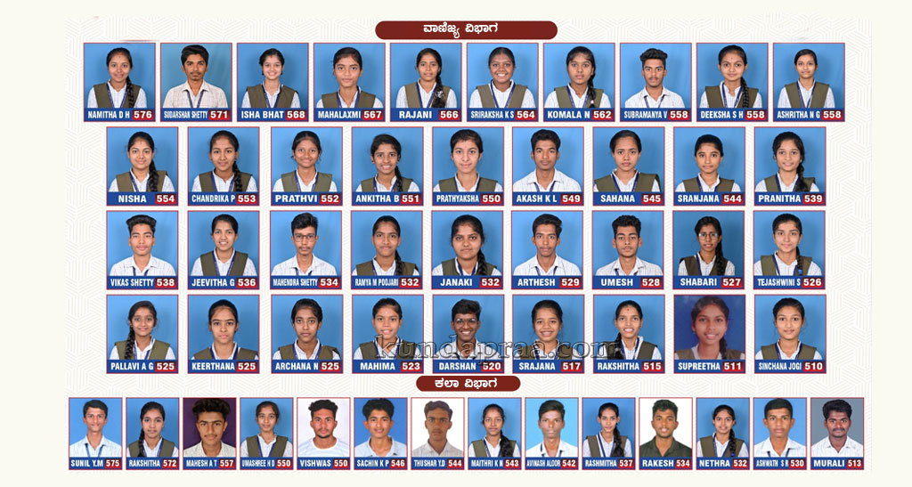 ವಾಣಿಜ್ಯ ವಿಭಾಗದಲ್ಲಿ ನಮಿತಾ ಡಿ.ಎಚ್ (576), ಸುದರ್ಶನ ಶೆಟ್ಟಿ (571), ಇಶಾ ಭಟ್( 568), ಮಹಾಲಕ್ಷ್ಮಿ (567), ರಜನಿ (566), ಶ್ರೀರಕ್ಷಾ (564) , ಕೋಮಲಾ.ಎನ್ (562), ಸುಬ್ರಹ್ಮಣ್ಯ .ವಿ (558), ದೀಕ್ಷಾ (558), ಆಶ್ರೀತಾ ಎನ್. ಜಿ (558), ನಿಶಾ (554), ಚಂದ್ರಿಕಾ (553), ಪ್ರಥ್ವಿ (552), ಅಂಕಿತಾ (551), ಪ್ರತ್ಯಕ್ಷಾ (550), ಆಕಾಶ್ ಕೆ.ಎಲ್ (549), ಸಹನಾ (545), ಸೃಜನಾ (544), ಪ್ರಣೀತಾ (539), ವಿಕಾಸ್ ಶೆಟ್ಟಿ (538), ಜೀವಿತಾ. ಜಿ (536), ಮಹೇಂದ್ರ ಶೆಟ್ಟಿ (534), ರಮ್ಯ ಎಮ್. ಪೂಜಾರಿ (532), ಜಾನಕಿ (532), ಅರ್ತಿಶ್ (529), ಉಮೇಶ (528), ಶಬರಿ (527), ತೇಜಸ್ವಿನಿ ಎಸ್ (526) , ಪಲ್ಲವಿ ಎ.ಜಿ (525), ಕಿರ್ತನಾ (525), ಅರ್ಚನಾ (525), ಮಹಿಮಾ (523), ದರ್ಶನ (520), ಸೃಜನಾ (517), ರಕ್ಷಿತಾ (515), ಸುಪ್ರೀತಾ (511), ಸಿಂಚನಾ (510) , ಕಲಾವಿಭಾಗದಲ್ಲಿ ಸುನೀಲ ವೈ.ಎಮ್ (575), ರಕ್ಷಿತಾ (572), ಮಹೇಶ (557), ಉಮಾಶ್ರೀ ಎಚ್.ಡಿ (550) ವಿಶ್ವ (550), ಸಚಿನ ಕೆ.ಪಿ (546), ತುಶಾರ ವೈ.ಡಿ (544) ಮೈತ್ರಿ ಕೆ.ಎನ್(543), ಅವಿನಾಶ್ ಆಲೂರು (542) ರಶ್ಮಿತಾ (537), ರಾಕೇಶ್ (534), ನೇತ್ರಾ (532), ಅಶ್ವತ ಎಸ್.ಆರ್ (530), ಮುರಾಲಿ (513) ಅಂಕಗಳಿಸಿದ್ದಾರೆ.