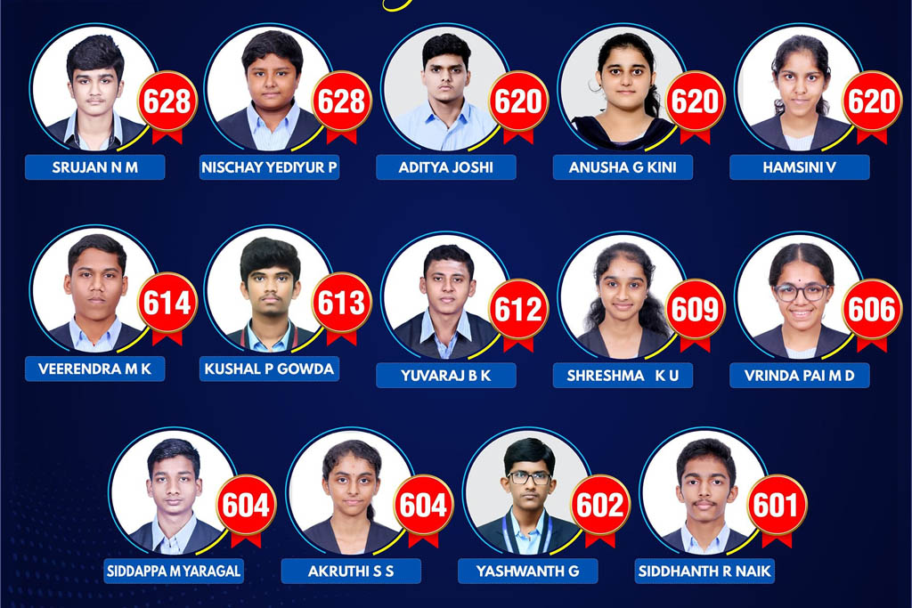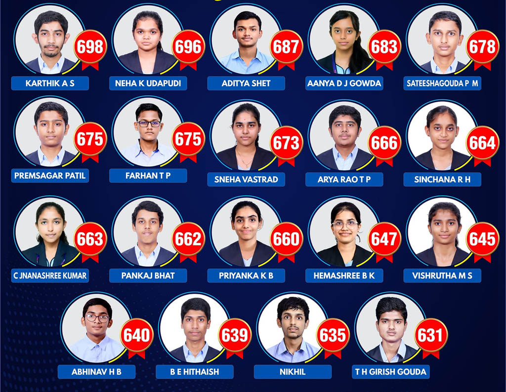 ಇತರ ವಿದ್ಯಾರ್ಥಿಗಳಾದ ಆದಿತ್ಯ ಶೇಟ್ 687, ಆನ್ಯಾ ಡಿ.ಜೆ ಗೌಡ 683, ಪ್ರೇಮ್ ಸಾಗರ್ ಪಾಟೀಲ್ 675, ಸತೀಶ್ ಗೌಡ ಪಿ. ಎಂ 678, ಫರ್ಹಾನ್ ಟಿ.ಪಿ 675, ಸ್ನೇಹಾ ವಸ್ತ್ರದ್ 673, ಆರ್ಯ ರಾವ್ ಟಿ.ಪಿ 666, ಸಿಂಚನ ಆರ್. ಹೆಚ್ 664, ಪ್ರಿಯಾಂಕ ಕೆ.ಬಿ 660, ಸಿ ಜನಶ್ರೀ ಕುಮಾರ್ 663, ಪಂಕಜ್ ಭಟ್ 662, ಹೇಮಶ್ರೀ ಬಿ. ಕೆ 647, ವಿಶ್ರುತ ಎಂ. ಎಸ್ 645, ಅಭಿನವ್ ಹೆಚ್.ಬಿ 640, ಬಿ.ಇ ಹಿತೈಷ್ 639, ಟಿ. ಹೆಚ್ ಗಿರೀಶ್ ಗೌಡ 631, ಸೃಜನ್ ಎನ್.ಎಂ 628, ನಿಶ್ಚಯ್ ಯಡಿಯೂರ್ ಪಿ 628, ಆದಿತ್ಯ ಜೋಶಿ 620, ಅನುಷಾ ಜಿ ಕಿಣಿ 620, ಹಂಸಿನಿ ವಿ 620, ವೀರೇಂದ್ರ ಎಂ ಕೆ 614, ಕುಶಾಲ್ ಪಿ ಗೌಡ 613, ಯುವರಾಜ್ ಬಿ ಕೆ 612, ಶ್ರೇಷ್ಮಾ ಕೆ ಯು 609, ವೃಂದಾ ಪೈ ಎಂ ಡಿ 606, ಸಿದ್ಧಪ್ಪ ಎಂ ಯರಗಲ್ 604, ಆಕೃತಿ ಎಸ್ ಎಸ್ 604, ಯಶವಂತ್ ಜಿ 602, ಸಿದ್ಧಾಂತ್ ಆರ್ ನಾಯ್ಕ್ 601 ಅಂಕಗಳು ಪಡೆದು ವಿಶಿಷ್ಟ ಸಾಧನೆಗೈದಿದ್ದಾರೆ.