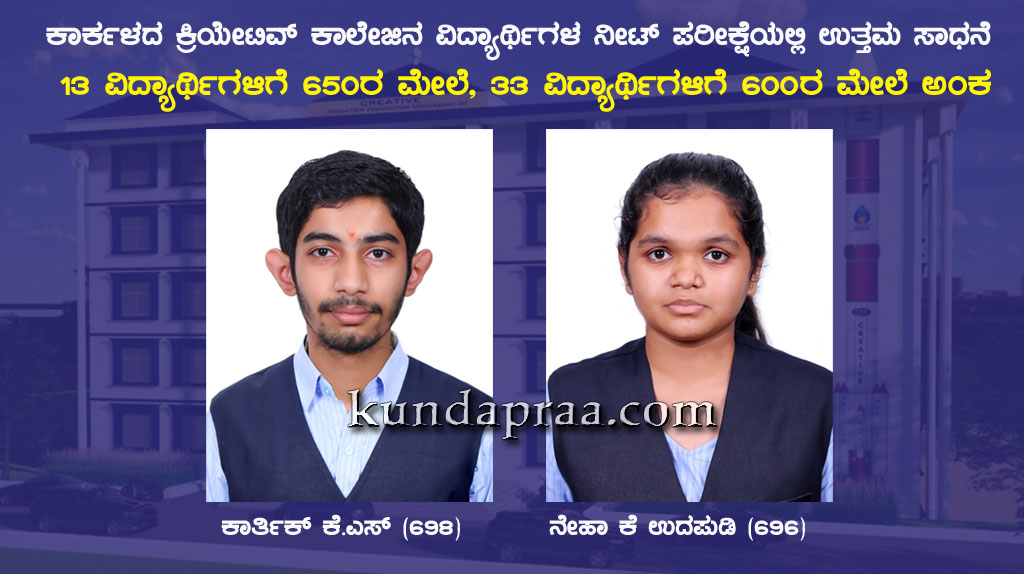 ಉಡುಪಿ: ದೇಶದ ಪ್ರತಿಷ್ಠಿತ ವೈದ್ಯಕೀಯ ವಿಶ್ವವಿದ್ಯಾನಿಲಯಗಳಿಗೆ ರಾಷ್ಟ್ರೀಯ ಪರೀಕ್ಷಾ ಪ್ರಾಧಿಕಾರ ಮೇ 05 ರಂದು ನಡೆಸಿದ ನೀಟ್ ಪರೀಕ್ಷೆಯ ಫಲಿತಾಂಶ ಪ್ರಕಟಗೊಂಡಿದ್ದು, ಕಾರ್ಕಳದ ಕ್ರಿಯೇಟಿವ್ ಕಾಲೇಜಿನ ವಿದ್ಯಾರ್ಥಿಗಳು ಅತ್ಯುನ್ನತ ಅಂಕಗಳಿಸುವ ಮೂಲಕ ಅದ್ಭುತ ಸಾಧನೆಗೈದಿದ್ದಾರೆ.
