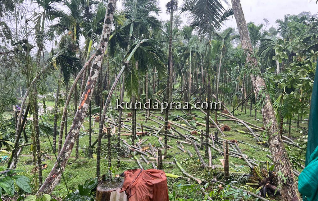 ಇಂದು ಬೆಳಿಗ್ಗೆ ಮಳೆಯೊಂದಿಗೆ ಬೀಸಿದ ಸುಂಟರಗಾಳಿ ಮನೆ, ಕೊಟ್ಟಿಗೆ, ತೋಟಗಳನ್ನು ಹೊಕ್ಕು ಅಪಾರ ಹಾನಿಯನ್ನುಂಟುಮಾಡಿದೆ. ಗ್ರಾಮಿಣ ಭಾಗವಾದ ಅಮಾಸೆಬೈಲು ಗ್ರಾಮ ಪಂಚಾಯತ್ ವ್ಯಾಪ್ತಿಯ ರಟ್ಟಾಡಿ ಹಾಗೂ ಕೊಳಂಜೆ ಎಂಬಲ್ಲಿ ಕೃಷಿ ತೋಟಕ್ಕೆ ಅಪಾರ ಹಾನಿ ಸಂಭವಿಸಿದೆ. ಕೊಳಂಜೆಯಲ್ಲಿ ಸುಮಾರು ಮೂರೂವರೆ ಎಕರೆ ಕೃಷಿ ಭೂಮಿ ಸುಂಟರಗಾಳಿಯ ತೀವ್ರತೆಗೆ ಧ್ವಂಸವಾಗಿದೆ. ಹಲವಾರು ಮನೆಗಳಿಗೂ ಹಾನಿಯಾಗಿವೆ. ಜಡ್ಡಿನಗದ್ದೆ, ರಟ್ಟಾಡಿ, ಹೊರ್ಲಿಜೆಡ್ಡು ಭಾಗದ ಸುಮಾರು 3000ದಷ್ಟು ಅಡಿಕೆ ಮರಗಳು ನೆಲಕ್ಕುರುಳಿವೆ.