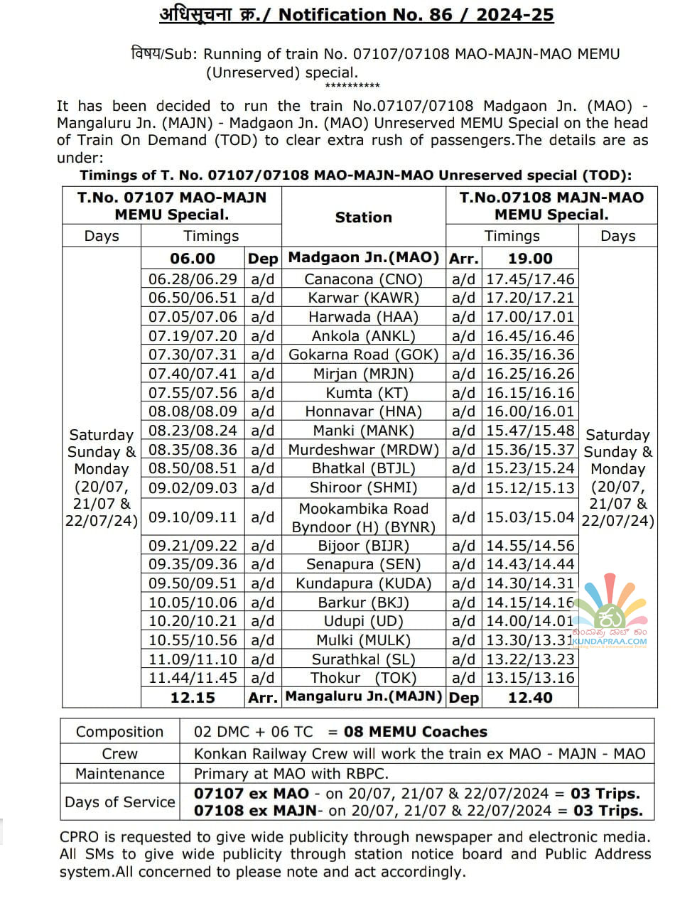 ಬೆಂಗಳೂರು ಮಂಗಳೂರು ರೈಲಿಗೆ ಮಡಗಾಂವ್ ಮಂಗಳೂರು ಜಂಕ್ಷನ್ ಮದ್ಯೆ ಮೂರು ದಿನಗಳ ವಿಶೇಷ ಲಿಂಕ್ ರೈಲಿನ ವ್ಯವಸ್ಥೆ ಕಲ್ಪಿಸಲಾಗಿದೆ. ಮಡಗಾಂವ್ ಮಂಗಳೂರು ಜಂಕ್ಷನ್ ವಿಶೇಷ ಲಿಂಕ್ ರೈಲಿಗೆ ಉಡುಪಿ, ಬಾರ್ಕೂರು, ಕುಂದಾಪುರ, ಸೇನಾಪುರ, ಬಿಜೂರು, ಬೈಂದೂರು, ಶಿರೂರು, ಭಟ್ಕಳ, ಮುರುಡೇಶ್ವರ ಮೊದಲಾದ ಸ್ಟೇಷನ್ಗಳಲ್ಲಿ ನಿಲುಗಡೆ ಇರಲಿದೆ.