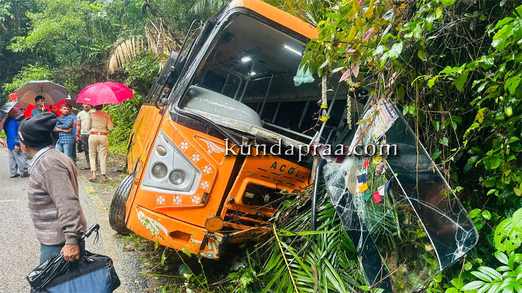 ಶಿವಮೊಗ್ಗದಿಂದ ಕೊಲ್ಲೂರಿಗೆ ಬರುತ್ತಿದ್ದ ಬಸ್ಸು ಚಾಲಕನ ನಿಯಂತ್ರಣ ತಪ್ಪಿ ಅವಘಡ ಸಂಭವಿಸಿದ್ದು ಬಸ್ಸಿನ ಮುಂಭಾಗ ಜಖಂಗೊಂಡಿದೆ. ಬಸ್ಸಿನಲ್ಲಿದ್ದ ಕೊಲ್ಲೂರು ಪಿಯು ಕಾಲೇಜಿನ 10 ವಿದ್ಯಾರ್ಥಿಗಳು ಹಾಗೂ ಹೈಸ್ಕೂಲಿನ 6 ಮಂದಿ ವಿದ್ಯಾರ್ಥಿಗಳು ಸಹಿತ ಪ್ರಯಾಣಿಕರಿಗೆ ಗಾಯಗಳಾಗಿದೆ. ಗಾಯಾಳು ವಿದ್ಯಾರ್ಥಿಗಳನ್ನು ಕುಂದಾಪುರ ಸರಕಾರಿ ಆಸ್ಪತ್ರೆಗೆ ದಾಖಲಿಸಲಾಗಿದೆ. ಬಸ್ಸಿನಲ್ಲಿದ್ದ ಇತರ ಪ್ರಯಾಣಿಕರು ಪ್ರಾಣಾಪಾಯದಿಂದ ಪಾರಾಗಿದ್ದಾರೆ. ಆಸ್ಪತ್ರೆಗೆ ದಾಖಲಾಗಿದ್ದ 16 ವಿದ್ಯಾರ್ಥಿಗಳ ಪೈಕಿ 3 ವಿದ್ಯಾರ್ಥಿಗಳು ಚಿಕಿತ್ಸೆ ಪಡೆದು ಹಿಂದಿರುಗಿದ್ದಾರೆ. ವಿದ್ಯಾರ್ಥಿಗಳು ರಜೆ ಮುಗಿಸಿ ಸೋಮವಾರ ಮತ್ತೆ ಬಸ್ಸಿನಲ್ಲಿ ಕೊಲ್ಲೂರಿನ ಶಾಲೆಗೆ ವಾಪಾಸ್ಸಾಗುತ್ತಿದ್ದರು.