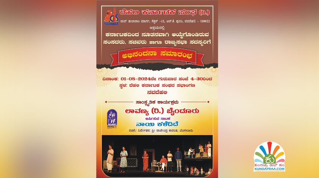 ದೆಹಲಿ ಕರ್ನಾಟಕ ಸಂಘದ ವತಿಯಿಂದ ಅಗಸ್ಟ್‌ 1ರಂದು ಆಯೋಜಿಸಲಾಗಿರುವ ಕರ್ನಾಟಕದ ನೂತನ ಸಂಸದವರು, ಸಚಿವರು ಹಾಗೂ ರಾಜ್ಯಸಭಾ ಸದಸ್ಯರಿಗೆ ಸನ್ಮಾನ ಅಭಿನಂದನಾ ಕಾರ್ಯಕ್ರಮದ ಬಳಿಕ ಬೈಂದೂರು ಲಾವಣ್ಯ ಸಂಸ್ಥೆಯ ನಾಟಕ ಪ್ರದರ್ಶನಗೊಳ್ಳಲಿದೆ.
