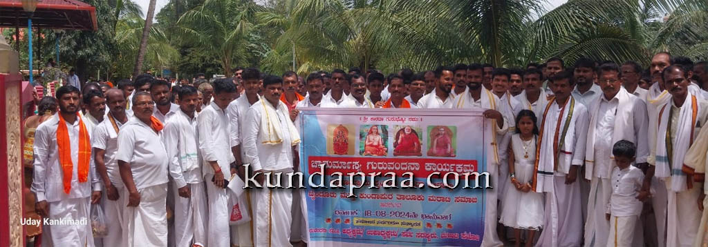 ಬೈಂದೂರು: ಶೃಂಗೇರಿ ಶಾರದಾ ಪೀಠದ ಚಾತುರ್ಮಾಸ್ಯ ಆಚರಣೆಯ ಸಂದರ್ಭದಲ್ಲಿ ಬೈಂದೂರು ಮತ್ತು ಕುಂದಾಪುರ ವಲಯದ 36 ಕೇರಿಯ ಸಮಸ್ತ ಮರಾಠಿ ಸಮಾಜ ಬಾಂಧವರು, ಗುರಿಕಾರರು ಮತ್ತು ಮುಖಂಡರನ್ನು ಒಳಗೊಂಡು ಜಗದ್ಗುರು ಶ್ರೀ ಭಾರತಿ ತೀರ್ಥ ಸ್ವಾಮಿ ಅವರಿಗೆ ಗುರುವಂದನೆ ಸಲ್ಲಿಸಿದರು.