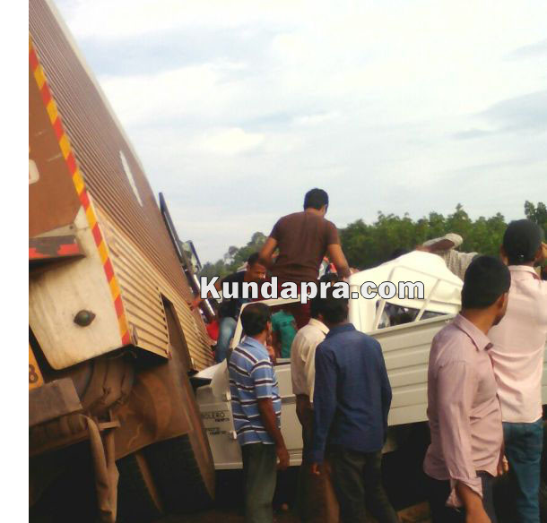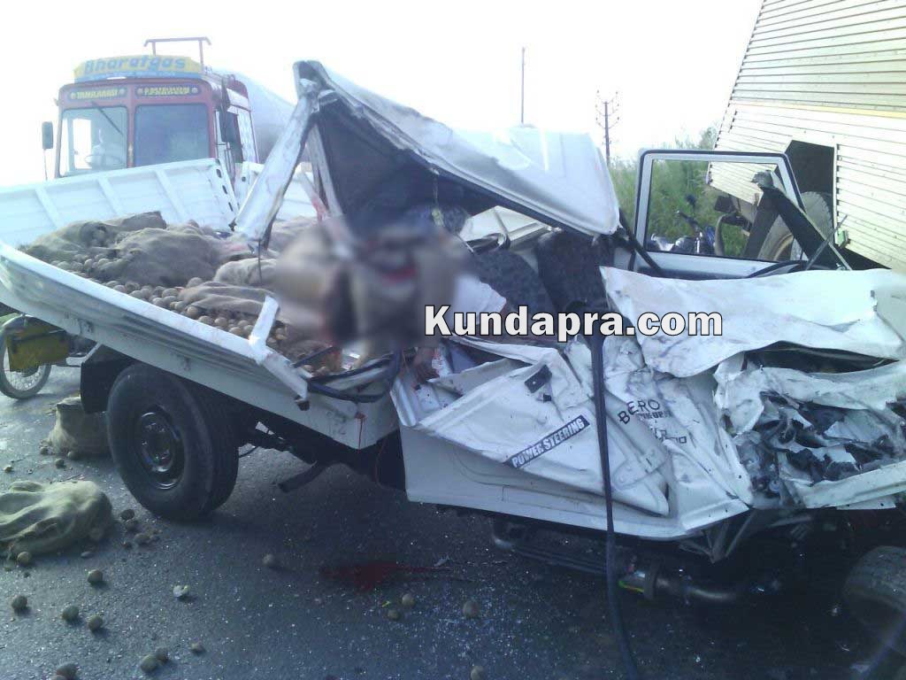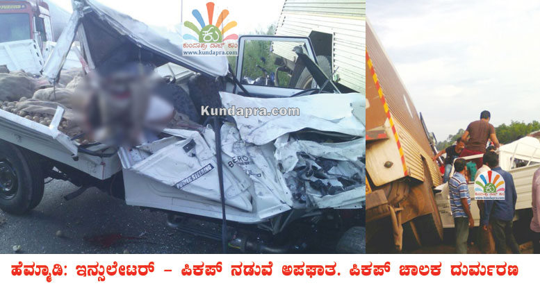 ಹೆಮ್ಮಾಡಿಯ ಜಾಲಾಡಿ ಸೇತುವೆ ಸಮೀಪ ರಾಷ್ಟ್ರೀಯ ಹೆದ್ದಾರಿಯಲ್ಲಿ ಬೈಂದೂರು ಕಡೆಯಿಂದ ಶೋರೂಮಿಗೆ ತೆರಳುತ್ತಿದ್ದ ಹೊಸ ಬೊಲೊರೋ ಪಿಕಪ್ ವಾಹನವು ಓವರಟೇಕ್ ಮಾಡುವ ಭರದಲ್ಲಿ ಕುಂದಾಪುರ ಕಡೆಯಿಂದ ನಾವುಂದಕ್ಕೆ ತೆರಳುತ್ತಿದ್ದ ಇನ್ಸುಲೇಟರ್ ವಾಹನ ಡಿಕ್ಕಿ ಹೊಡೆದಿತ್ತು. ಡಿಕ್ಕಿಯ ರಭಸಕ್ಕೆ ಪಿಕಪ್ ಸಂಪೂರ್ಣ ನುಜ್ಜುಗುಜ್ಜಾಗಿದ್ದು, ಚಾಲಕನ ತಲೆಯ ಭಾಗ ಮುರಿದು ಅಲ್ಲಿಯೇ ಮೃತಪಟ್ಟಿದ್ದಾನೆ. ಇನ್ಸುಲೇಟರ್ ಗೆ ಡಿಕ್ಕಿ ಹೊಡೆದ ಪಿಕಪ್ ಇನ್ನೊಂದು ಲಾರಿಗೂ ಡಿಕ್ಕಿ ಹೊಡೆದಿರುವುದಲ್ಲದೇ ಇನ್ಸುಲೇಟರ್ ನ ಕೆಳಭಾಗದಲ್ಲಿ ಸಿಲುಕಿಕೊಂಡಿತ್ತು. ಚಾಲಕನ್ನು ದೇಹವನ್ನು ಅದರಿಂದ ಹೊರತೆಗೆಯಲು ಹರಸಾಹಸ ಪಡಬೇಕಾಯಿತು. ಘಟನೆಯಲ್ಲಿ ಇನ್ಸುಲೇಟರ್ ಮುಂಭಾಗ ಸಂಪೂರ್ಣ ಹಾನಿಗೊಳಗಾಗಿದ್ದು ಅದರ ಚಾಲಕನಿಗೂ ಗಾಯಗಳಾಗಿವೆ. (ಕುಂದಾಪ್ರ ಡಾಟ್ ಕಾಂ)