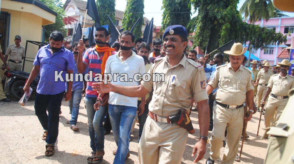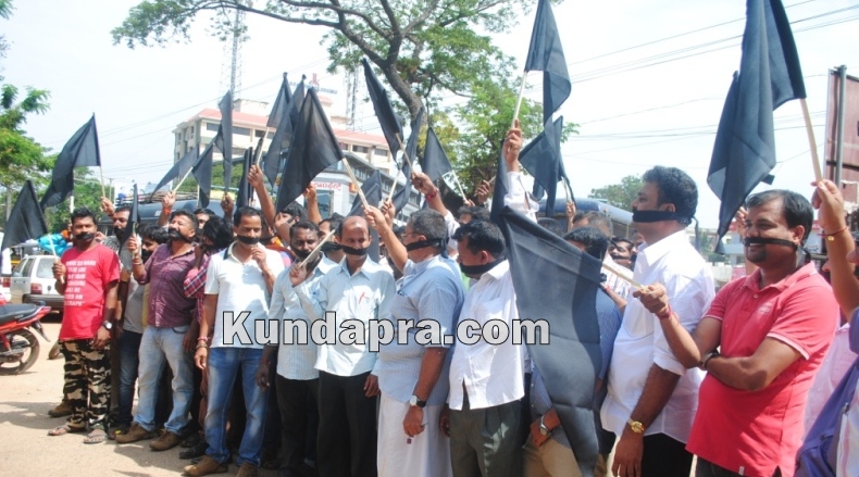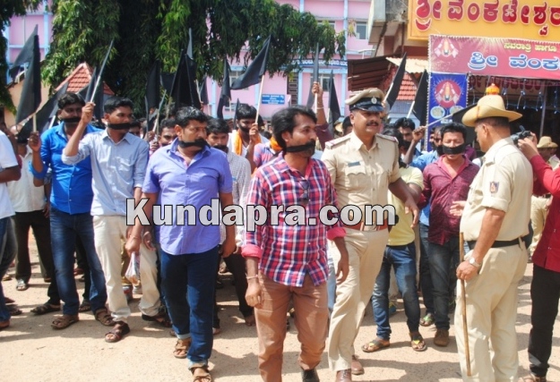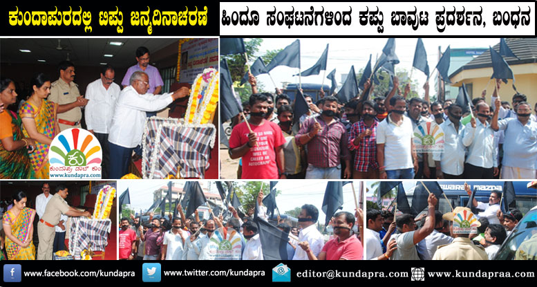 ಅತ್ತ ತಾಲೂಕು ಆಡಳಿತ ಟಿಪ್ಪು ಜನ್ಮ ದಿನಾಚರಣೆಯನ್ನು ಆಚರಿಸುತ್ತಿದ್ದರೇ ಇತ್ತ ತಾಲೂಕು ಪಂಚಾಯತ್ ಕಛೇರಿ ಎದುರು ನೂರಾರು ಸಂಖ್ಯೆಯಲ್ಲಿ ಸೇರಿದ್ದ ಹಿಂದೂ ಸಂಘಟನೆಗಳ ಕಾರ್ಯಕರ್ತರು ಜಯಂತಿ ಆಚರಣೆಗೆ ವಿರೋಧ ವ್ಯಕ್ತಪಡಿಸಿದರು. ಬಾಯಿಗೆ ಕಪ್ಪು ಬಟ್ಟೆ ಕಟ್ಟಿ, ಕಪ್ಪು ಬಾವುಟ ಪ್ರದರ್ಶಿಸಿ ಮೌನ ಪ್ರತಿಭಟನೆಗಿಳಿದ ಕಾರ್ಯಕರ್ತರುಗಳು ಕಪ್ಪು ದಿನಾಚರಣೆ ಆಚರಿಸಿದರು. ಸರಕ್ಷತೆಯ ದೃಷ್ಟಿಯಿಂದ ಕಪ್ಪು ಬಾವುಟ ತೋರಿಸಿದವರನ್ನು ಬಂಧಿಸಿ ಕೊನೆಗೆ ಬಿಡುಗಡೆಗೊಳಿಸಲಾಯಿತು. ತಾಲೂಕು ಪಂಚಾಯತ್ ಎದುರು ಬಿಗಿ ಪೊಲೀಸ್ ಬಂದೋವಸ್ತ್ ಏರ್ಪಡಿಸಲಾಗಿತ್ತು. (ಕುಂದಾಪ್ರ ಡಾಟ್ ಕಾಂ ಸುದ್ದಿ) ಇನ್ನೊಂದೆಡೆ ಟಿಪ್ಪು ಜಯಂತಿ ಆಚರಣೆಗೆ ಕುಂದಾಪುರದವರ ಸಾಮಾಜಿಕ ತಾಣಗಳಲ್ಲಿಯೂ ಭಾರಿ ವಿರೋಧ ವ್ಯಕ್ತವಾಗಿದೆ. ಫೇಸ್ಬುಕ್, ವಾಟ್ಸಪ್ ಪ್ರೋಫೈಲ್ ಗೆ ಕಪ್ಪು ಬಾವುಟ, ಕಪ್ಪು ಕರ್ನಾಟಕದ ಚಿತ್ರ ಹಾಕಿಕೊಳ್ಳುವ ಮೂಲಕ ತಮ್ಮ ವಿರೋಧವನ್ನು ವ್ಯಕ್ತಪಡಿಸಿದ್ದಾರೆ.[/quote]