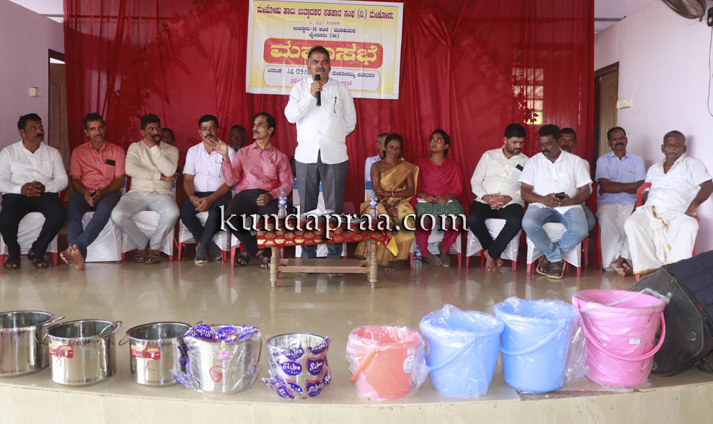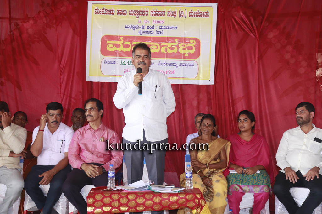 ಮೇಕೊಡು ಶ್ರೀ ದುರ್ಗಾಪರಮೇಶ್ವರಿ ದೇವಳದ ಸಭಾಭವನದಲ್ಲಿ ಶನಿವಾರ ನಡೆದ ಮೇಕೋಡು ಹಾಲು ಉತ್ಪಾದಕರ ಸಹಕಾರಿ ಸಂಘದ ಮಹಾಸಭೆ, ಕರು ಸಾಕಾಣಿಕೆ ಯೋಜನೆಯ ನೋಂದಾಯಿತ ಕರುಗಳ ಪ್ರದರ್ಶನ ಹಾಗೂ ಸನ್ಮಾನ ಕಾರ್ಯಕ್ರಮದ ಅಧ್ಯಕ್ಷತೆ ವಹಿಸಿ ಮಾತನಾಡಿದರು.