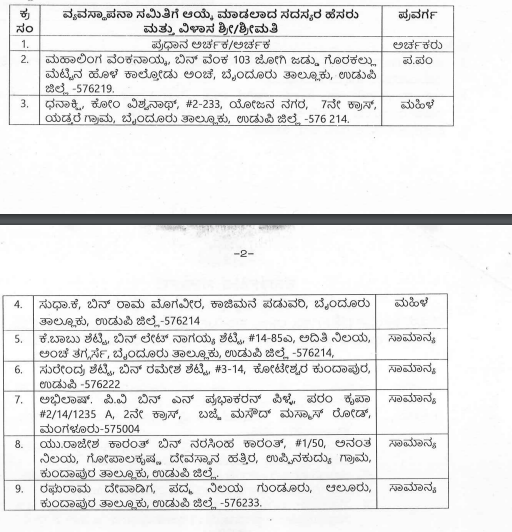 ಸದಸ್ಯರನ್ನು ಓರ್ವರನ್ನು ವ್ಯವಸ್ಥಾಪನಾ ಸಮಿತಿ ಅಧ್ಯಕ್ಷರನ್ನಾಗಿ ನೇಮಿಸುವಂತೆ ರಾಜ್ಯ ಧಾರ್ಮಿಕ ಪರಿಷತ್ ಸದಸ್ಯ ಕಾರ್ಯದರ್ಶಿ ಹಾಗೂ ಹಿಂದೂ ಧಾರ್ಮಿಕ ಸಂಸ್ಥೆಗಳು ಮತ್ತು ಧರ್ಮಾದಾಯ ದತ್ತಿಗಳ ಇಲಾಖೆಯ ಆಯುಕ್ತ ಹೊರಡಿಸಿರುವ ಆದೇಶದಲ್ಲಿ ತಿಳಿಸಲಾಗಿದೆ.