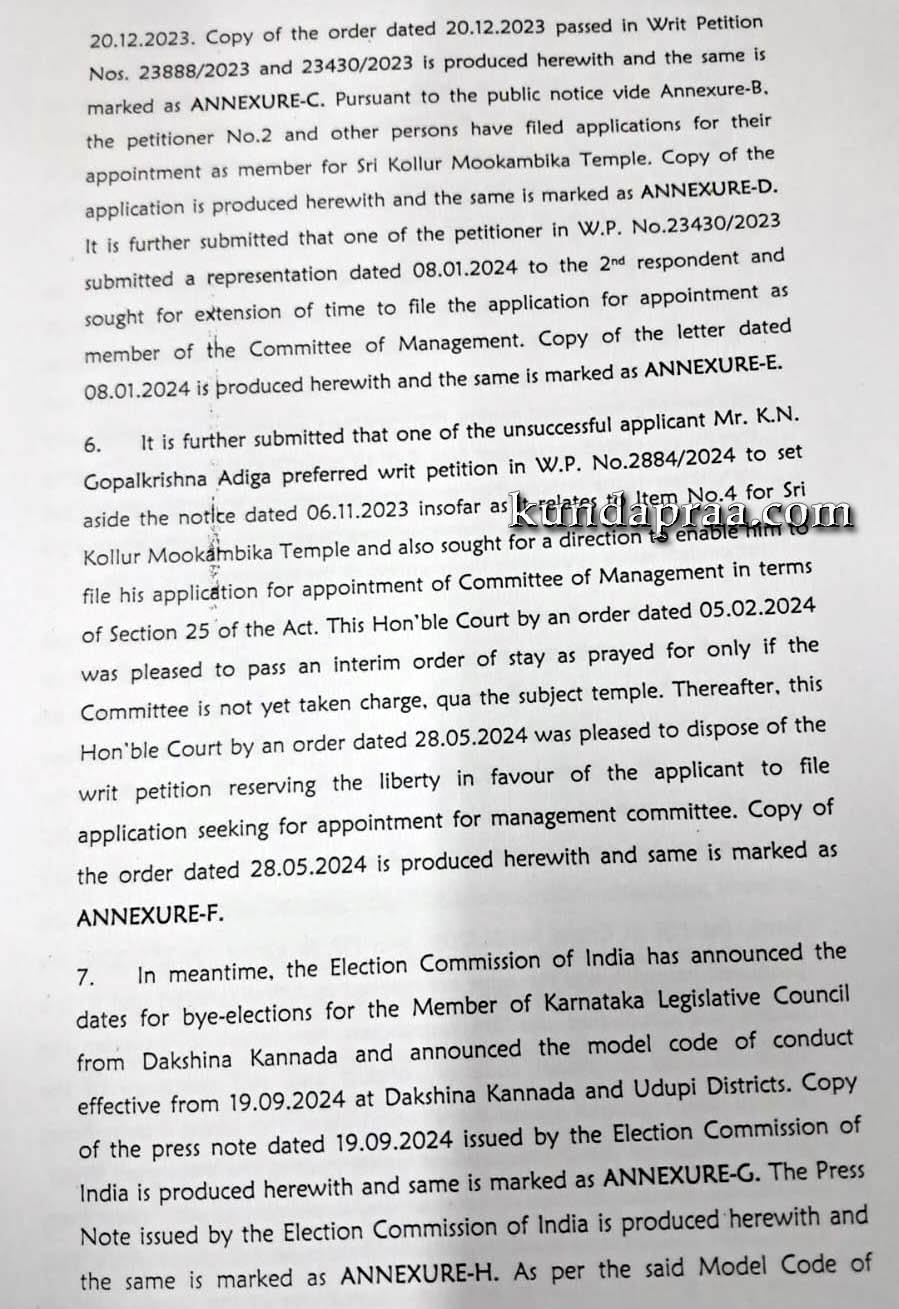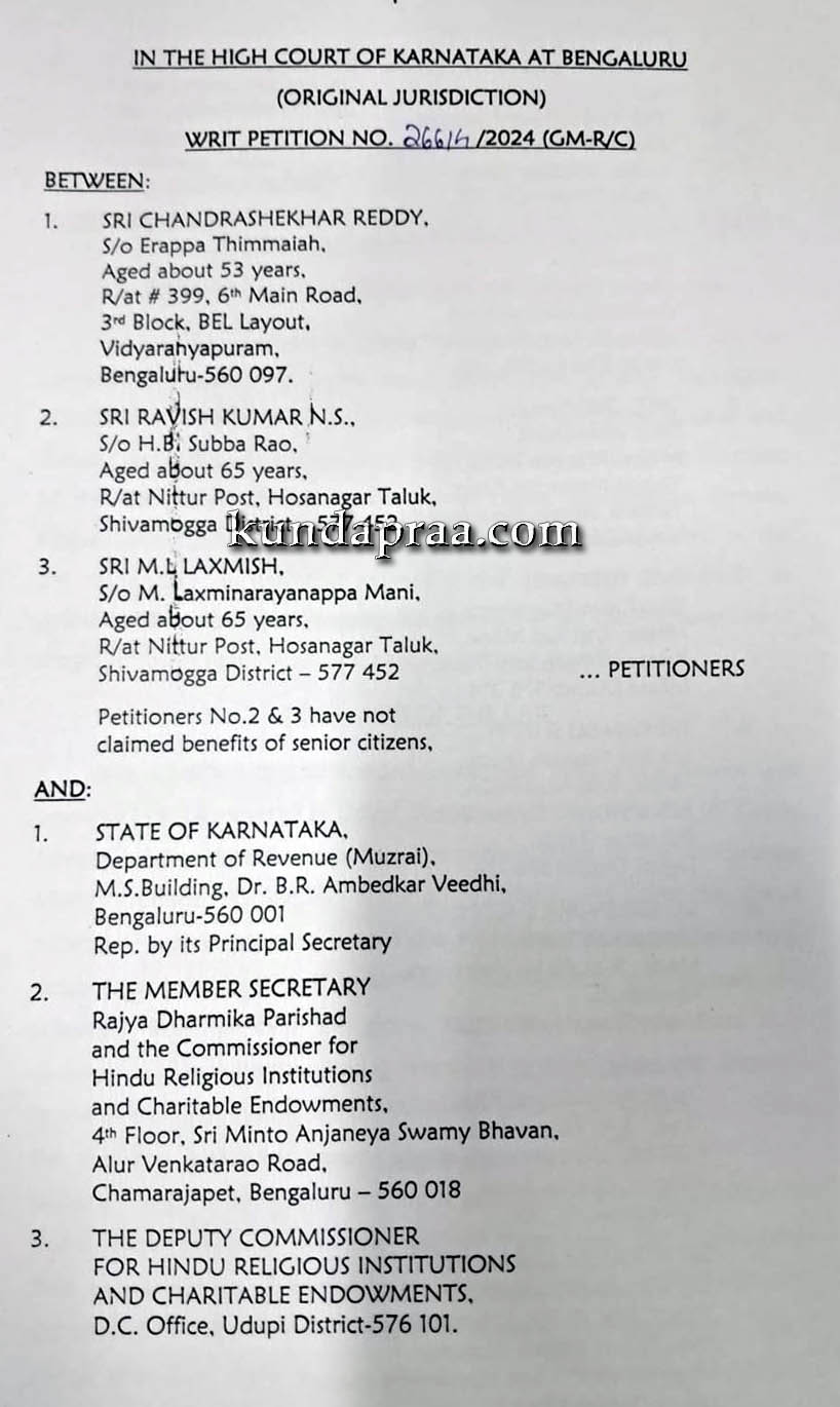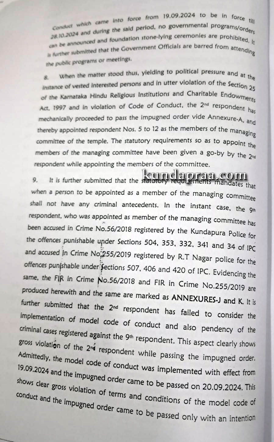 ಸೆ.20ರಂದು ರಾಜ್ಯ ಧಾರ್ಮಿಕ ಪರಿಷತ್ ಸದಸ್ಯ ಕಾರ್ಯದರ್ಶಿ ಹಾಗೂ ಹಿಂದೂ ಧಾರ್ಮಿಕ ಸಂಸ್ಥೆಗಳು ಮತ್ತು ಧರ್ಮಾದಾಯ ದತ್ತಿಗಳ ಇಲಾಖೆಯ ಆಯುಕ್ತರು 9 ಮಂದಿ ವ್ಯವಸ್ಥಾಪನಾ ಸಮಿತಿ ಸದಸ್ಯರನ್ನು ನೇಮಿಸಿ ಆದೇಶ ಹೊರಡಿಸಿದ್ದರು. ಆದರೆ ಸೆ.19ರಿಂದ ವಿಧಾನ ಪರಿಷತ್ ಚುನಾವಣೆಯ ನೀತಿ ಸಂಹಿತೆ ಜಾರಿಯಾಗಿರುವುದರಿಂದ ಇದು ನೀತಿ ಸಂಹಿತೆಯ ಉಲ್ಲಂಘನೆ ಎಂದು ವಾದಿಸಲಾಗಿದೆ. ಅಲ್ಲದೇ ಓರ್ವ ಸದಸ್ಯರ ವಿರುದ್ದ ಅಪರಾಧ ಪ್ರಕರಣ ದಾಖಲಾಗಿದೆ. ಅವರನ್ನು ಸದಸ್ಯರನ್ನಾಗಿ ನೇಮಿಸಿರುವುದು ಸರಿಯಲ್ಲ ಎಂಬ ವಾದವನ್ನು ಹೈಕೋರ್ಟ್ ಮುಂದಿಡಲಾಗಿದೆ. ಈ ಬಗ್ಗೆ ಚಂದ್ರಶೇಖರ ರೆಡ್ಡಿ ಬೆಂಗಳೂರು, ರವೀಶ್ ಕುಮಾರ್ ನಿಟ್ಟೂರು, ಎ.ಎಲ್. ಲಕ್ಷ್ಮೀಶ್ ನಿಟ್ಟೂರು ಎಂಬುವವರು ರಿಟ್ ಅರ್ಜಿ ಸಲ್ಲಿಸಿದ್ದು ಅದರಂತೆ ಇಲಾಖಾ ಆಯುಕ್ತರ ಆದೇಶ ಅನುಷ್ಠಾನಗೊಳಿಸಲು ತಾತ್ಕಾಲಿಕ ತಡೆ ನೀಡಿರುವ ಹೈಕೋರ್ಟ್ ಕಲಾಪವನ್ನು ಸೋಮವಾರಕ್ಕೆ ಮುಂದೂಡಲಾಗಿದೆ. ಕುಂದಾಪ್ರ ಡಾಟ್ ಕಾಂ.