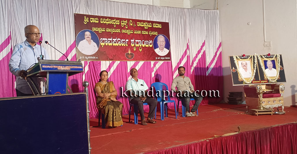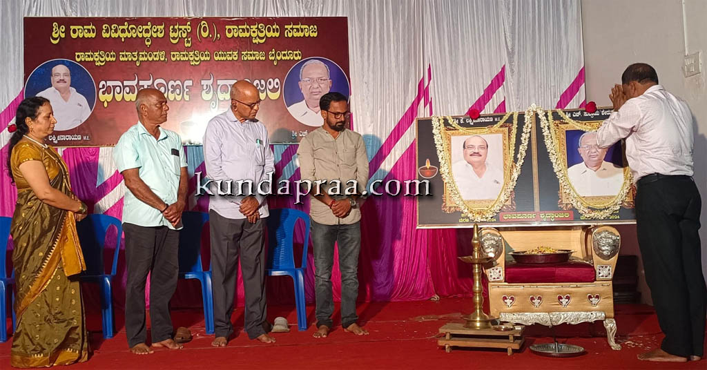 ಬೈಂದೂರು: ಶ್ರೀ ರಾಮ ವಿವಿಧೋದ್ದೇಶ ಟ್ರಸ್ಟ್ ಬೈಂದೂರು, ರಾಮಕ್ಷತ್ರಿಯ ಸಮಾಜ ಬೈಂದೂರು, ರಾಮಕ್ಷತ್ರಿಯ ಮಾತೃ ಮಂಡಳಿ ಬೈಂದೂರು ಹಾಗೂ ರಾಮಕ್ಷತ್ರಿಯ ಯುವಕ ಸಮಾಜ ಬೈಂದೂರು ಇವರ ಜಂಟಿ ಆಶ್ರಯದಲ್ಲಿ ಭಾನುವಾರ ಇಲ್ಲಿನ ಶ್ರೀ ಸೀತಾರಾಮಚಂದ್ರ ಕಲ್ಯಾಣ ಮಂಟಪದಲ್ಲಿ ಜರುಗಿದ ಕಾರ್ಯಕ್ರಮದಲ್ಲಿ ಇತ್ತೀಚಿಗೆ ನಿಧನರಾದ ಮಾಜಿ ಶಾಸಕರಾದ ಕೆ. ಲಕ್ಷ್ಮೀನಾರಾಯಣ ಹಾಗೂ ಪುರಸಭಾ ಮಾಜಿ ಅಧ್ಯಕ್ಷರಾದ ಹೊಸಾಡು ಸುಬ್ರಾಯ ಶೇರುಗಾರ್ ಅವರಿಗೆ ನುಡಿನಮನ ಸಲ್ಲಿಸಲಾಯಿತು.