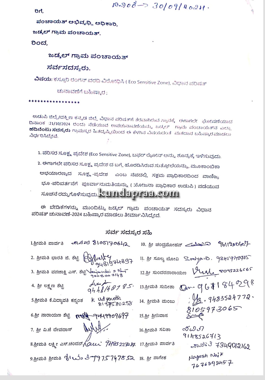 ಜಡ್ಕಲ್ ಗ್ರಾಮ ಪಂಚಾಯತ್ ಸದಸ್ಯರಾದ ಪಾರ್ವತಿ, ಭಾರತಿ ಜಿ. ಶೆಟ್ಟಿ, ವನಜಾಕ್ಷಿ ಎಸ್.ಶೆಟ್ಟಿ, ಲಕ್ಷ್ಮಣ ಶೆಟ್ಟಿ, ಕೆ.ವಿದ್ಯಾವತಿ ಕನ್ನಂತ, ನಾರಾಯಣ ಶೆಟ್ಟಿ, ವಿ.ಜೆ ದೇವದಾಸ್, ಲಕ್ಷ್ಮೀ ಎಸ್.ಚಂದನ್, ಶ್ರೀಮತಿ, ಚಂದ್ರಮೋಹನ್, ಸೂಲ್ಯ ಬೋವಿ, ಸುಂದರನಾರಾಯಣ, ಸುನೀತಾ, ಮಂಜು, ಶ್ರೀನಿವಾಸ, ಸವಿತಾ, ಪಾರ್ವತಿ ಹಾಗೂ ನಾಗೇಶ ಗ್ರಾಮಸ್ಥರ ಹಿತದೃಷ್ಟಿಯಿಂದ ವಿಧಾನ ಪರಿಷತ್ ಉಪ ಚುನಾವಣೆ ಬಹಿಷ್ಕಾರದ ನಿರ್ಧಾರ ಮಾಡಿದ್ದಾರೆ.