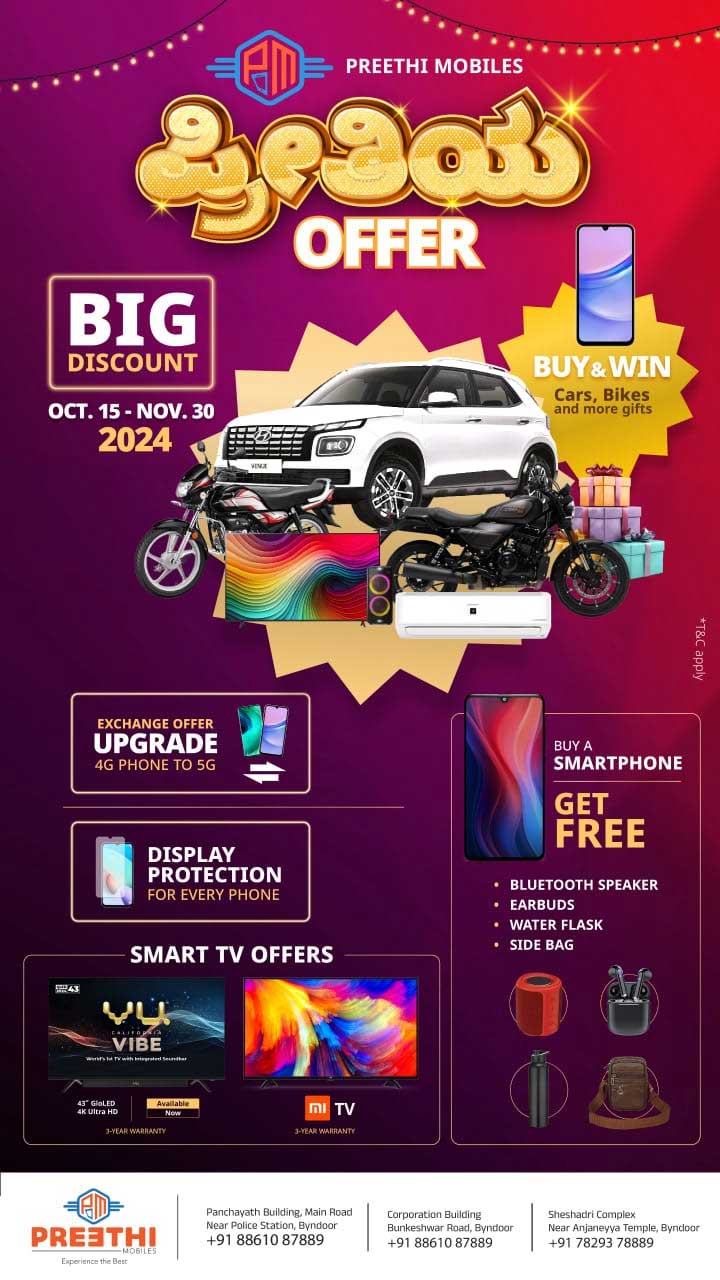 ದೀಪಾವಳಿಯ ಅಂಗವಾಗಿ ಈ ಆಫರ್ ನ.30ರ ತನಕ ಇರಲಿದೆ. ಹೆಚ್ಚಿನ ಮಾಹಿತಿ ಹಾಗೂ ಖರೀದಿಗೆ ಬೈಂದೂರು ಪೊಲೀಸ್ ಸ್ಟೇಷನ್ ಎದುರಿನ ಪಂಚಾಯತ್ ಕಟ್ಟಡದಲ್ಲಿರುವ ‘ಪ್ರೀತಿ ಮೊಬೈಲ್ಸ್’ ಮಳಿಗೆ, ಬೈಂದೂರು ಬಂಕೇಶ್ವರ ರಸ್ತೆಯ ಪಂಚಾಯತ್ ಕಟ್ಟಡದಲ್ಲಿನ ಮಳಿಗೆ ಅಥವಾ ಆಂಜನೇಯ ದೇವಸ್ಥಾನದ ಬಳಿಕ ಶೇಷಾದ್ರಿ ಕಾಂಪ್ಲೆಕ್ಸ್ ಮಳಿಗೆಗೆ ಭೇಟಿ ನೀಡಬಹುದಾಗಿದೆ.