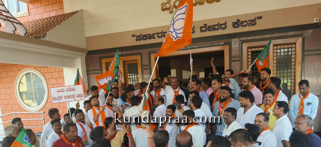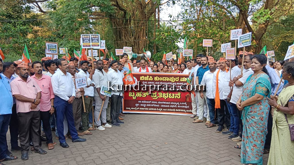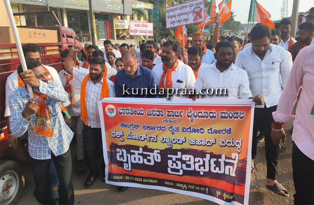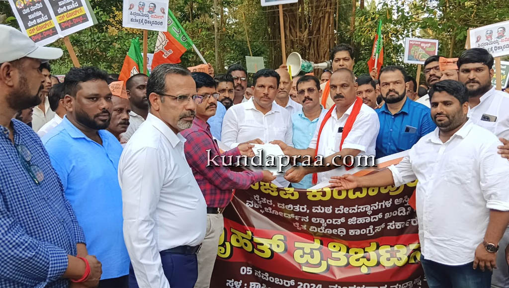 ಕುಂದಾಪುರ,ನ.06: ರಾಜ್ಯ ಕಾಂಗ್ರೆಸ್ ಸರ್ಕಾರದ ರೈತ ವಿರೋಧಿ ಧೋರಣೆ ಹಾಗೂ ವಕ್ಫ್ ಬೋರ್ಡ್ ನ ಧೋರಣೆ ಖಂಡಿಸಿ ಕುಂದಾಪುರ ಮಂಡಲ ಬಿಜೆಪಿ ವತಿಯಿಂದ ಪ್ರತಿಭಟನೆ ನಡೆಯಿತು.