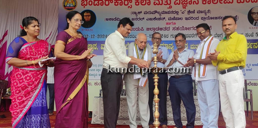 ಕುಂದಾಪುರ: ಇಲ್ಲಿನ ಭಂಡಾರ್ಕಾರ್ಸ್ ಕಾಲೇಜಿನಲ್ಲಿ ನಡೆಯುತ್ತಿರುವ ಬ್ರಹತ್ ವಿಜ್ಞಾನ ವಾಣಿಜ್ಯ ಕಲೆ ಪರಿಸರ ಸಾಮಾನ್ಯ ಜ್ಞಾನ ಮತ್ತು ಶೈಕ್ಷಣಿಕ ವಸ್ತು ಪ್ರದರ್ಶನದಲ್ಲಿ ಕೈಗಾರಿಕಾ ಮಾಹಿತಿ ಮತ್ತು ವೃತ್ತಿ ಮಾರ್ಗದರ್ಶನ ಶಿಬಿರ, ವಿದ್ಯಾರ್ಥಿಗಳ ವ್ಯಾಪಾರ ಮಳಿಗೆ ಮತ್ತು ಗ್ರಂಥಾಲಯದ ಕಲಾ ಗ್ಯಾಲರಿಯನ್ನು ಗಂಗೊಳ್ಳಿ ಉದ್ಯಮಿಯಾದ ದತ್ತಾನಂದ ಅವರು ಉದ್ಘಾಟಿಸಿದರು.