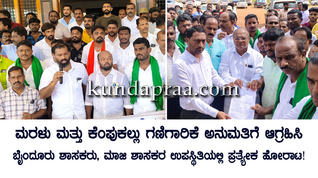 ಬೈಂದೂರು ತಾಲೂಕು ವ್ಯಾಪ್ತಿಯಲ್ಲಿ ಮರಳು ಮತ್ತು ಕೆಂಪುಕಲ್ಲು ಗಣಿಗಾರಿಕೆಗೆ ಅನುಮತಿ ನೀಡಬೇಕು ಎಂದು ಆಗ್ರಹಿಸಿ ಶಾಸಕ ಗುರುರಾಜ ಗಂಟಿಹೊಳೆ, ದಿವಾಕರ್ ಶೆಟ್ಟಿ ಅವರ ನೇತೃತ್ವದಲ್ಲಿ ಇಲ್ಲಿನ ಆಡಳಿತಸೌಧದ ಎದುರು ಪ್ರತಿಭಟನೆ ನಡೆದರೆ, ಮಾಜಿ ಶಾಸಕ ಕೆ. ಗೋಪಾಲ ಪೂಜಾರಿ, ಬೈಂದೂರು ರೈತ ಸಂಘದ ಅಧ್ಯಕ್ಷ ದೀಪಕ್ಕುಮಾರ್ ಶೆಟ್ಟಿ, ವಿಜಯಕುಮಾರ ಶೆಟ್ಟಿ ಅವರ ನೇತೃತ್ವದಲ್ಲಿ ಲಾರಿ ಮತ್ತು ಕೆಂಪುಕೋರೆ ಮಾಲಕರು ಹಾಗೂ ಕಾರ್ಮಿಕರು, ಇಲ್ಲಿನ ಅಂಡರ್ಪಾಸ್ನಿಂದ ಮೆರವಣೆಗೆ ಮೂಲಕ ಬೈಂದೂರು ತಾಲೂಕು ಆಡಳಿತಸೌಧಕ್ಕೆ ತೆರಳಿ ತಹಶೀಲ್ದಾರ ಅವರಿಗೆ ಮನವಿಪತ್ರ ಸಲ್ಲಿಸಿದರು.