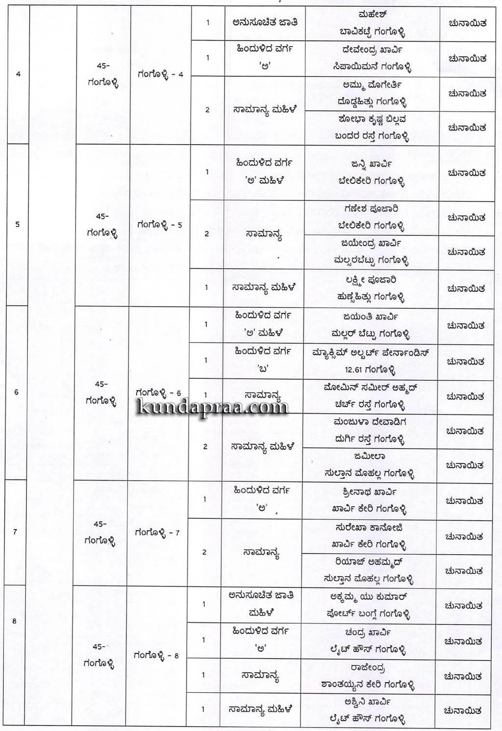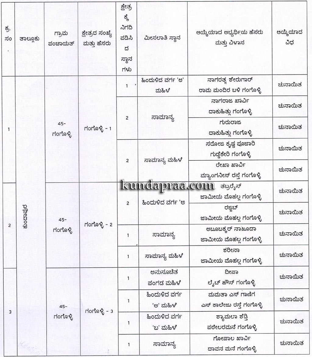 ಗಂಗೊಳ್ಳಿಯ ಒಟ್ಟು 8 ವಾರ್ಡ್ಗಳಲ್ಲಿ 1ನೇ ವಾರ್ಡಿನ ಒಟ್ಟು ಐದು ಸ್ಥಾನಗಳಲ್ಲಿ ಗುರುರಾಜ, ರೇಖಾ ಖಾರ್ವಿ ಸರೋಜಕೃಷ್ಣ ಪೂಜಾರಿ, ನಾಗರಾಜ ಖಾರ್ವಿ, ನಾಗರತ್ನ ಶೇರುಗಾರ್ ಗೆಲುವು ಸಾಧಿಸಿದ್ದಾರೆ. 2ನೇ ವಾರ್ಡಿನಲ್ಲಿ ತಬ್ರರೈಸ್, ಶರೀನಾ, ಅಬೂಬಕ್ಕರ್ ನಾಕುದಾ ಹಾಗೂ ರಜಬ್ ಗೆಲುವು ಸಾಧಿಸಿದ್ದಾರೆ. 3ನೇ ವಾರ್ಡಿನಲ್ಲಿ ದೀಪಾ, ಗೋಪಾಲ್ ಖಾರ್ವಿ, ಮಮತಾ ಎಸ್ ಗಾಣಿಗ, ಶ್ಯಾಮಲ ಶೆಡ್ತಿ ಗೆಲುವು ಸಾಧಿಸಿದರೆ 4ನೇ ವಾರ್ಡಿನಲ್ಲಿ ಮಹೇಶ್, ಅಮ್ಮು ಮೊಗೇರ್ತಿ, ಶೋಭಾ ಕೃಷ್ಣ ಬಿಲ್ಲವ, ದೇವೇಂದ್ರ ಖಾರ್ವಿ ಗೆಲುವು ಸಾಧಿಸಿದ್ದಾರೆ. 5ನೇ ವಾರ್ಡಿನಲ್ಲಿ ಲಕ್ಷ್ಮಿಪೂಜಾರಿ, ಜನ್ನಿ ಖಾರ್ವಿ, ಗಣೇಶ್ ಪೂಜಾರಿ, ಜಯೇಂದ್ರ ಖಾರ್ವಿ ಗೆಲುವು ಸಾಧಿಸಿದ್ದಾರೆ. 6ನೇ ವಾರ್ಡಿನಲ್ಲಿ ಮಂಜುಳಾ ದೇವಾಡಿಗ, ಮ್ಯಾಕ್ಸಿಮ್ ಆಲ್ಬರ್ಟ್, ಫೆರ್ನಾಂಡಿಸ್, ಮೊಮಿನ್ ಸಮೀರ್ ಅಹ್ಮದ್ ಗೆಲುವು ಸಾಧಿಸಿದ್ದಾರೆ. 7ನೇ ವಾರ್ಡಿನಲ್ಲಿ ಸುರೇಖಾ ಕಾನೋಜಿ, ಶ್ರೀನಾಥ್ ಖಾರ್ವಿ, ರಿಯಾಜ್ ಅಹ್ಮದ್ ಹಾಗೂ 8ನೇ ವಾರ್ಡಿನಲ್ಲಿ ಚಂದ್ರ ಖಾರ್ವಿ, ಅಕ್ಕಮ್ಮ ಯು ಕುಮಾರ್, ಅಶ್ವಿನಿ ಖಾರ್ವಿ, ರಾಜೇಂದ್ರ ಗೆಲುವಿನ ನಗೆ ಬೀರಿದ್ದಾರೆ. ಕುಂದಾಪ್ರ ಡಾಟ್ ಕಾಂ