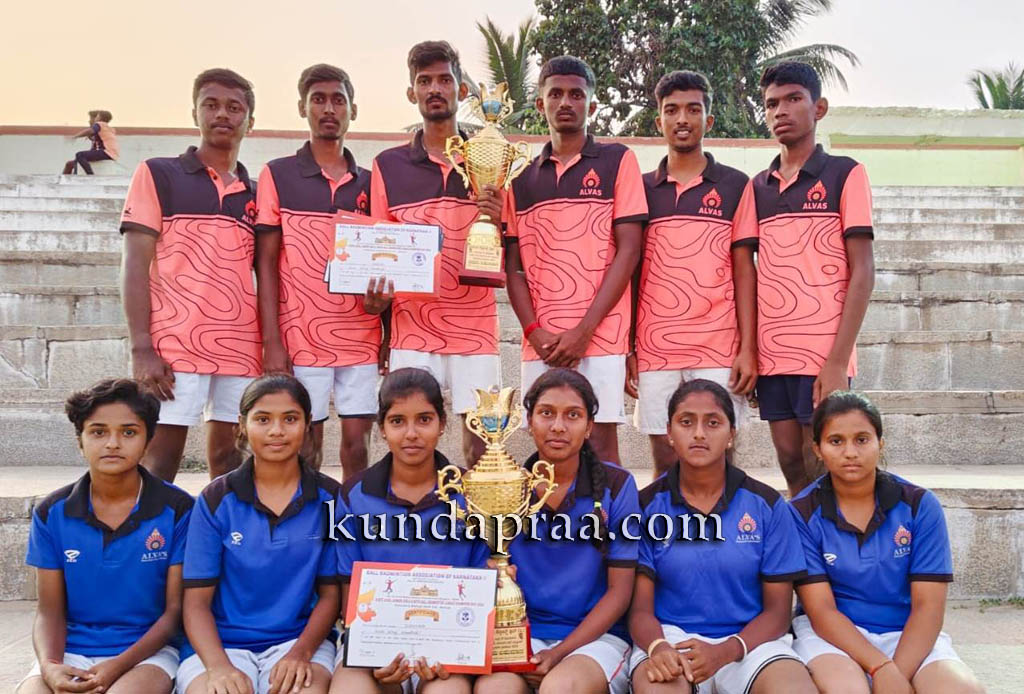 ಮೂಡುಬಿದಿರೆ: ಕರ್ನಾಟಕ ಬಾಲ್ ಬ್ಯಾಡ್ಮಿಂಟನ್ ಅಸೋಸಿಯನ್ ಹಾಗೂ ತುಮಕೂರು ಜಿಲ್ಲಾ ಬಾಲ್ ಬ್ಯಾಡ್ಮಿಂಟನ್ ಸಂಸ್ಥೆ ಇವುಗಳ ಜಂಟಿ ಆಶ್ರಯದಲ್ಲಿ ಮಧುಗಿರಿ ಸ್ಪೋಟ್ಸ್ ಕ್ಲಬ್ ಮಧುಗಿರಿಯಲ್ಲಿ ನಡೆದ ಕರ್ನಾಟಕ ರಾಜ್ಯಮಟ್ಟದ ಜ್ಯೂನಿಯರ ಬಾಲಕ ಹಾಗೂ ಬಾಲಕಿಯರ ಎರಡು ವಿಭಾಗದ ಪ್ರಥಮ ಪ್ರಶಸ್ತಿ ಹಾಗೂ ಬಾಲಕಿಯರ ದ್ವಿತೀಯ ಪ್ರಶಸ್ತಿಯನ್ನು ಮೂಡಬಿದಿರೆಯ ಆಳ್ವಾಸ್ ಶಿಕ್ಷಣ ಸಂಸ್ಥೆಯ ವಿದ್ಯಾರ್ಥಿಗಳು ಪಡೆದುಕೊಂಡರು.