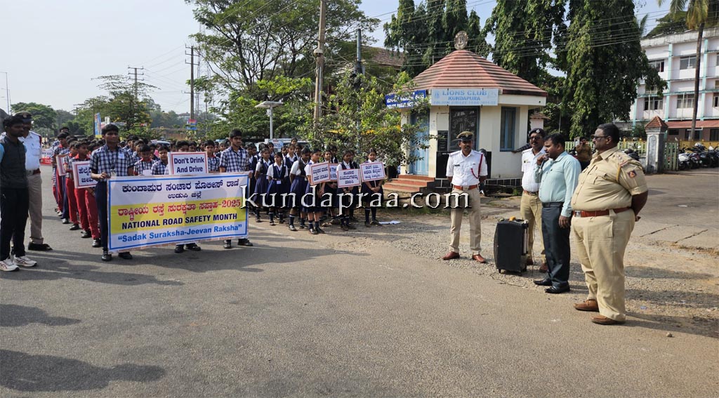 ರಾಷ್ಟ್ರೀಯ ರಸ್ತೆ ಸುರಕ್ಷತಾ ಸಪ್ತಾಹ 2025ರ ಅಂಗವಾಗಿ ಇಲ್ಲಿನ ವೆಂಕಟರಮಣ, ಒಕ್ ವುಡ, ಸೈಂಟ್ ಪಿಯೂಷ್ ಶಾಲೆಗಳ ವಿದ್ಯಾರ್ಥಿಗಳಿಂದ ರಸ್ತೆ ಸುರಕ್ಷತಾ ನಿಯಮ ಪಾಲಿಸುವ ಬಗ್ಗೆ ನಿಯಮಗಳ ಘೋಷಣೆಯೊಂದಿಗೆ ಕುಂದಾಪುರ ಶಾಸ್ತ್ರೀ ಪಾರ್ಕ್‌ನಿಂದ ಕುಂದಾಪುರ ಸಂಚಾರ ಠಾಣೆಯವರೆಗೆ ಜಾಥಾ ನಡೆಯಿತು.