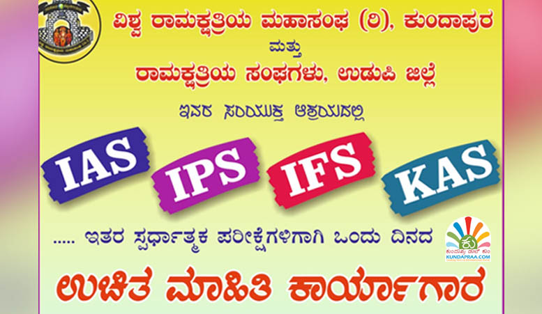 ವಿಶ್ವ ರಾಮಕ್ಷತ್ರಿಯ ಮಹಾಸಂಘ ರಿ. ಕುಂದಾಪುರ ಮತ್ತು ರಾಮಕ್ಷತ್ರಿಯ ಸಂಘಗಳು ಉಡುಪಿ ಜಿಲ್ಲೆ ಇವರ ಸಂಯುಕ್ತ ಆಶ್ರಯದಲ್ಲಿ ಐಎಎಸ್, ಐಪಿಎಸ್, ಐಎಫ್ಎಸ್, ಕೆಎಎಸ್ ಇತರ ಸ್ಪರ್ಧಾತ್ಮಕ ಪರೀಕ್ಷೆಗಳಿಗಾಗಿ ಒಂದು ದಿನದ ಉಚಿತ ಮಾಹಿತಿ ಕಾರ್ಯಗಾರವು ಫೆ.09 ಆದಿತ್ಯವಾರದಂದು ಬೆಳಿಗ್ಗೆ 9-00 ರಿಂದ ಮಧ್ಯಾಹ್ನ 2-30ರ ವರೆಗೆ ಬ್ರಹ್ಮಾವರ ತಾಲೂಕಿನ ಉಪ್ಪೂರು ರಾಮಕ್ಷತ್ರಿಯ ಸಭಾಭವನದಲ್ಲಿ ನಡೆಯಲಿದೆ.