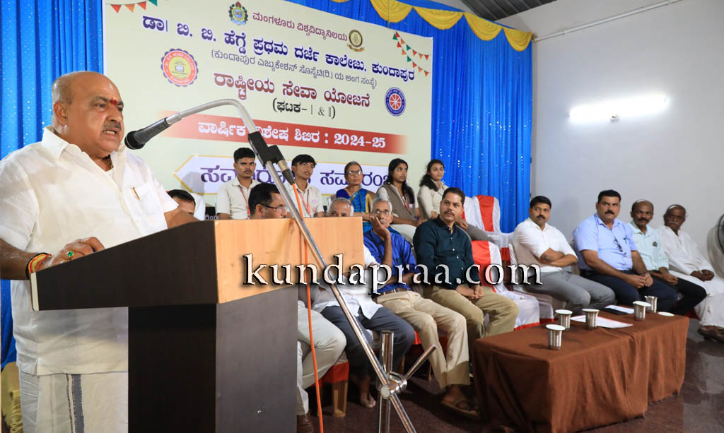 ಅವರು ಇಲ್ಲಿನ ವಡ್ಡರ್ಸೆ ಮಹತೋಭಾರ ಶ್ರೀ ಮಹಾಲಿಂಗೇಶ್ವರ ದೇವಸ್ಥಾನದಲ್ಲಿ ನಡೆದ ಕುಂದಾಪುರದ ಡಾ| ಬಿ.ಬಿ. ಹೆಗ್ಡೆ ಪ್ರಥಮ ದರ್ಜೆ ಕಾಲೇಜಿನ ರಾಷ್ಟ್ರೀಯ ಸೇವಾ ಯೋಜನಾ ಘಟಕಗಳ ವಾರ್ಷಿಕ ವಿಶೇಷ ಶಿಬಿರದ ಸಮಾರೋಪ ಸಮಾರಂಭದಲ್ಲಿ ಮಾತನಾಡಿದರು.