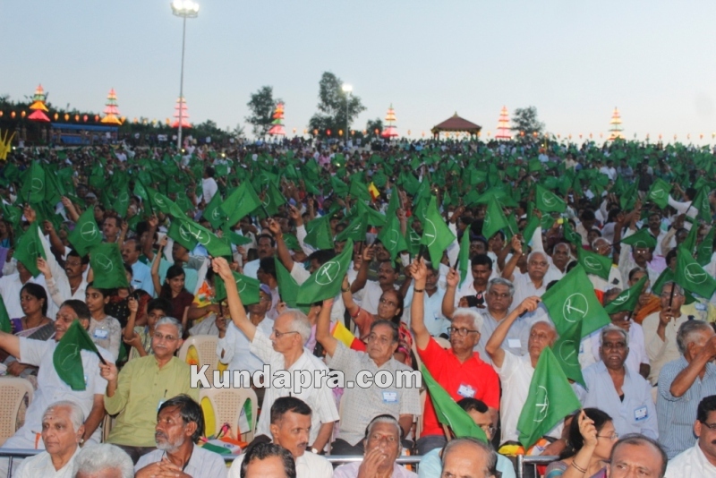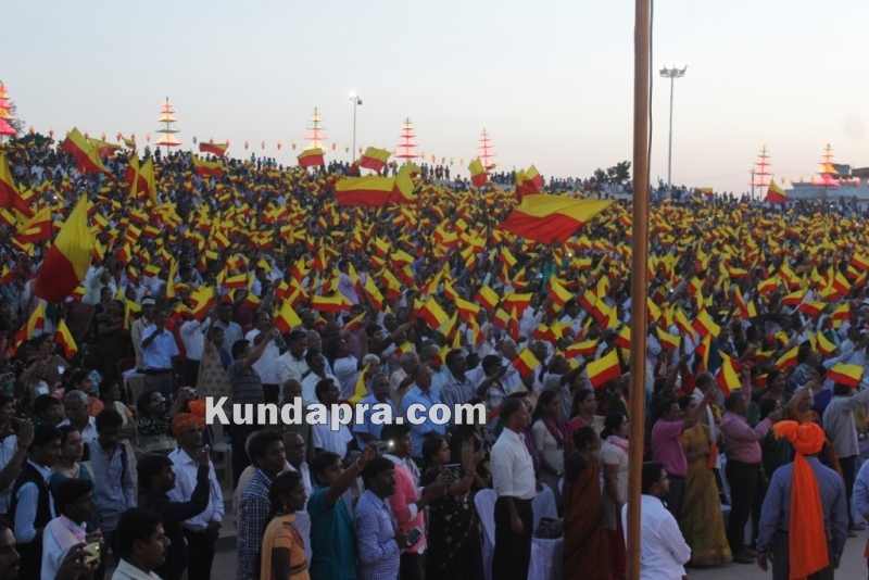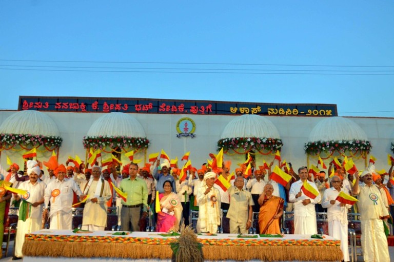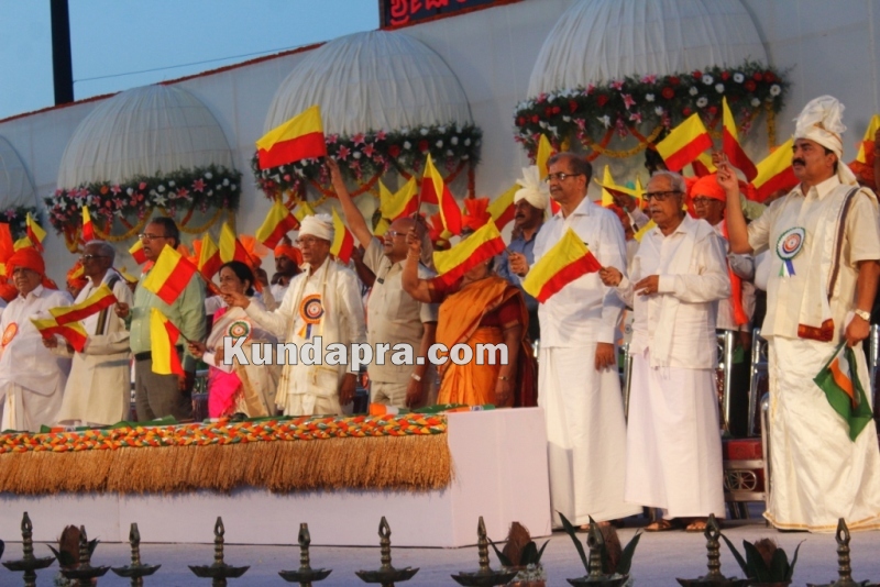 ಮೂಡುಬಿದಿರೆ: ನಾಡು ನುಡಿಯ ರಾಷ್ಟ್ರೀಯ ಸಮ್ಮೇಳನಕ್ಕೆ ಚಾಲನೆ ನೀಡುವುದಕ್ಕೂ ಮುನ್ನ ನಾಡಗೀತೆ, ರೈತಗೀತೆ, ಭಾವೈಕ್ಯ ಗೀತೆಗಳನ್ನು ಹಾಡುವಾಗ ನೆರೆದಿದ್ದ ವೇದಿಕೆಯಲ್ಲಿದ್ದ ಗಣ್ಯರು ಹಾಗೂ ಸಾವಿರಾರು ಪ್ರೇಕ್ಷಕರು ಕನ್ನಡ ನಾಡಿನ ಭಾವುಟ, ರೈತ ಧ್ವಜ ಹಾಗೂ ರಾಷ್ಟ್ರ ಧ್ವಜವನ್ನು ಬೀಸಿ ಗೌರವ ಸಲ್ಲಿಸಿದರು. ಪುತ್ತಿಗೆ ನುಡಿಸಿರಿ ಮೈದಾನದಲ್ಲಿ ತುಂಬಿದ್ದ ಪ್ರೇಕ್ಷಕರು ಕೈಯಲ್ಲಿದ್ದ ಧ್ವಜದ ವಿಹಂಗಮ ನೋಟ ವಿಶೇಷ ರಂಗು ನೀಡಿತ್ತು.