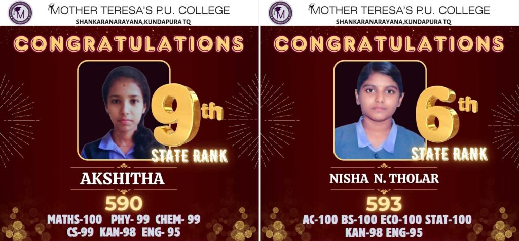 ಕುಂದಾಪುರ: ತಾಲೂಕಿನ ಶಂಕರನಾರಾಯಣದ ಮದರ್ ತೆರೇಸಾ’ಸ್ ಪಿ ಯು ಕಾಲೇಜಿಗೆ ರಾಜ್ಯಮಟ್ಟದಲ್ಲಿ 2 ರ್ಯಾಂಕ್ ದೊರೆತಿದೆ.