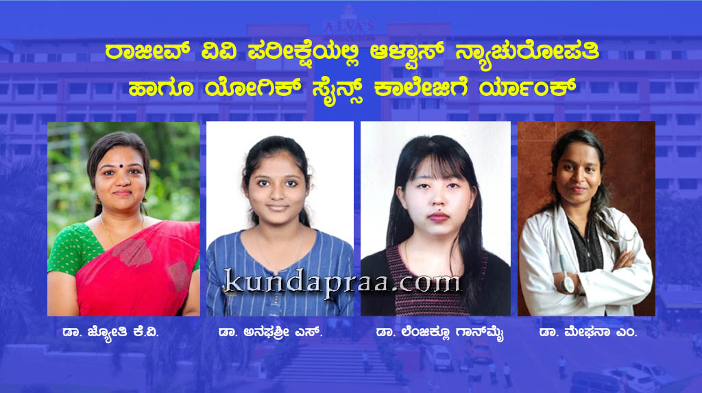 ಆಳ್ವಾಸ್ ನ್ಯಾಚುರೋಪತಿ ಹಾಗೂ ಯೋಗಿಕ್ ಸೈನ್ಸ್ ಕಾಲೇಜಿನ ಡಾ. ಜ್ಯೋತಿ ಕೆ. ವಿ. ಕ್ಲಿನಿಕಲ್ ನಾಚುರೋಪತಿ ವಿಭಾಗದಲ್ಲಿ ದ್ವಿತೀಯ ರ್ಯಾಂಕ್, ಡಾ. ಅನಘಶ್ರೀ ಎಸ್. ಕ್ಲಿನಿಕಲ್ ಯೋಗ ವಿಭಾಗದಲ್ಲಿ ತೃತೀಯ ರ್ಯಾಂಕ್, ಡಾ. ಲೆಂಜಿಕ್ಲೂ ಗಾನ್ಮೈ ಕ್ಲಿನಿಕಲ್ ಯೋಗ ವಿಭಾಗದಲ್ಲಿ ಆರನೆಯ ರ್ಯಾಂಕ್, ಡಾ. ಮೇಘನಾ ಎಂ. ಕ್ಲಿನಿಕಲ್ ನ್ಯಾಚುರೋಪತಿ ವಿಭಾಗದಲ್ಲಿ ಒಂಬತ್ತನೆಯ ರ್ಯಾಂಕ್ ಗಳಿಸಿದ್ದಾರೆ.