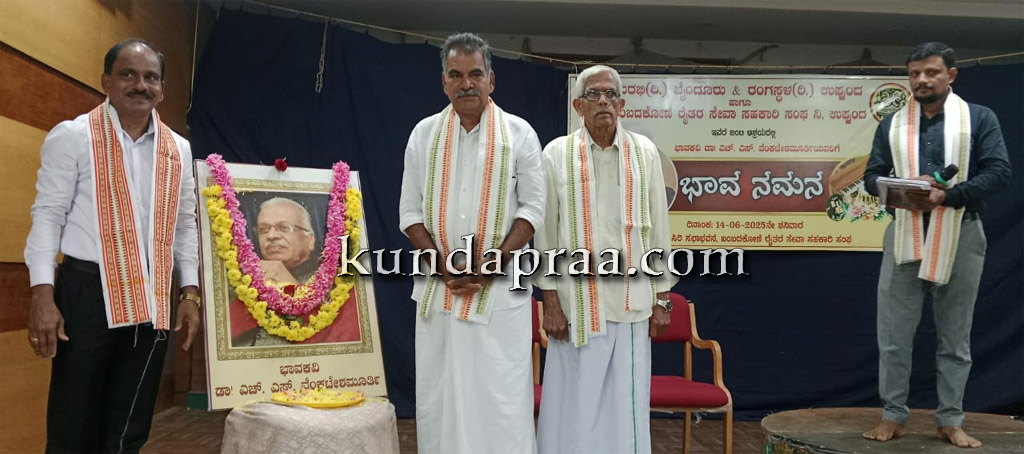 ಬೈಂದೂರು: ಸುರಭಿ ರಿ. ಬೈಂದೂರು, ರಂಗಸ್ಥಳ ಉಪ್ಪುಂದ ಹಾಗೂ ಕಂಬದಕೋಣೆ ರೈತರ ಸೇವಾ ಸಹಕಾರಿ ಸಂಘ ಉಪ್ಪುಂದ ಇವರ ಸಹಯೋಗದಲ್ಲಿ ಉಪ್ಪುಂದದ ರೈತ ಸಿರಿ ಸಭಾಭವನದಲ್ಲಿ ಭಾವ ಕವಿ ಪ್ರಸಿದ್ಧ ಸಾಹಿತಿ ಡಾ. ಎಚ್.ಎಸ್. ವೆಂಕಟೇಶ್ ಮೂರ್ತಿ ಅವರಿಗೆ “ಭಾವ ನಮನ” ಕಾರ್ಯಕ್ರಮವನ್ನು ಏರ್ಪಡಿಸಲಾಗಿತ್ತು