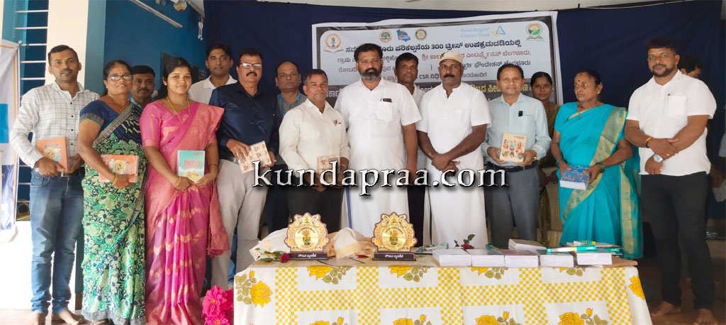 ಕುಂದಾಪುರ: ಸಮೃದ್ಧ ಬೈಂದೂರು 300 ಟ್ರೀಸ್ ಉಪಕ್ರಮದ ಅಡಿಯಲ್ಲಿ ಕೆನರಾ ಬ್ಯಾಂಕ್ ಸಿದ್ದಾಪುರ, ಕಾಲಭೈರವೇಶ್ವರ ಎಂಟರ್ಪ್ರೈಸಸ್ ಬೆಂಗಳೂರು, ರೋಟರಿ ಕ್ಲಬ್ ಸಿದ್ದಾಪುರ ಹೊಸಂಗಡಿ, ಸ್ವಯಂ ಸ್ಫೂರ್ತಿ ಫೌಂಡೇಶನ್ ಬೆಂಗಳೂರು ಇದರ ಸಹಕಾರದೊಂದಿಗೆ ಮಂಗಳವಾರದಂದು ಹಳ್ಳಿಹೊಳೆ ಗ್ರಾ. ಪಂ. ವ್ಯಾಪ್ತಿಯ ಎಲ್ಲಾ ಶಾಲಾ ಮಕ್ಕಳಿಗೆ ಕೊಡೆ ವಿತರಣೆ ಹಾಗೂ ಕೆರಾಡಿ, ಆಜ್ರಿ, ಭಾಗದ ಆಯ್ದ ಶಾಲೆಗಳಿಗೆ ನೋಟ್ ಬುಕ್ ಮತ್ತು ಕಲಿಕಾ ಸಾಮಗ್ರಿ ವಿತರಣೆ ಮಾಡಲಾಯಿತು.