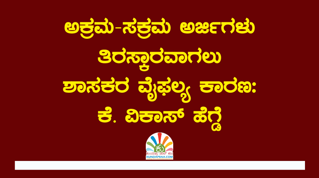 ಕುಂದಾಪುರ: ಅಕ್ರಮ-ಸಕ್ರಮ ಯೋಜನೆಯಡಿಯಲ್ಲಿ ಅರ್ಜಿ ನಮೂನೆ 94 ಸಿ ಮತ್ತು 94 ಸಿ ಸಿ ಅಡಿಯಲ್ಲಿ ಅರ್ಜಿ ಸಲ್ಲಿಸಿದ ಸಾವಿರಾರು ಅರ್ಜಿಗಳು ತಿರಸ್ಕಾರವಾಗಲು ಶಾಸಕರ ವೈಫಲ್ಯ ಕಾರಣ ಎಂದು ಜಿಲ್ಲಾ ಕಾಂಗ್ರೆಸ್ ವಕ್ತಾರ ಕೆ. ವಿಕಾಸ್ ಹೆಗ್ಡೆ ಆರೋಪಿಸಿದ್ದಾರೆ.